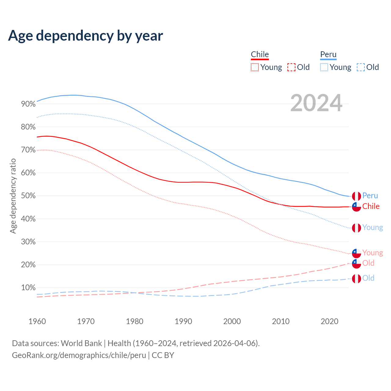 - Chile is ranked 61/196 by median age (oldest to youngest) vs 97/196 for Peru.
