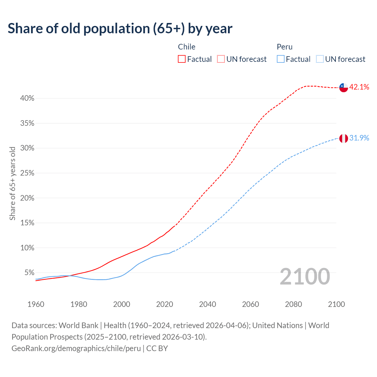 The share of older people aged 65 and over is 14.1% in Chile and 9.23% in Peru. Life expectancy in Chile compared to Peru .