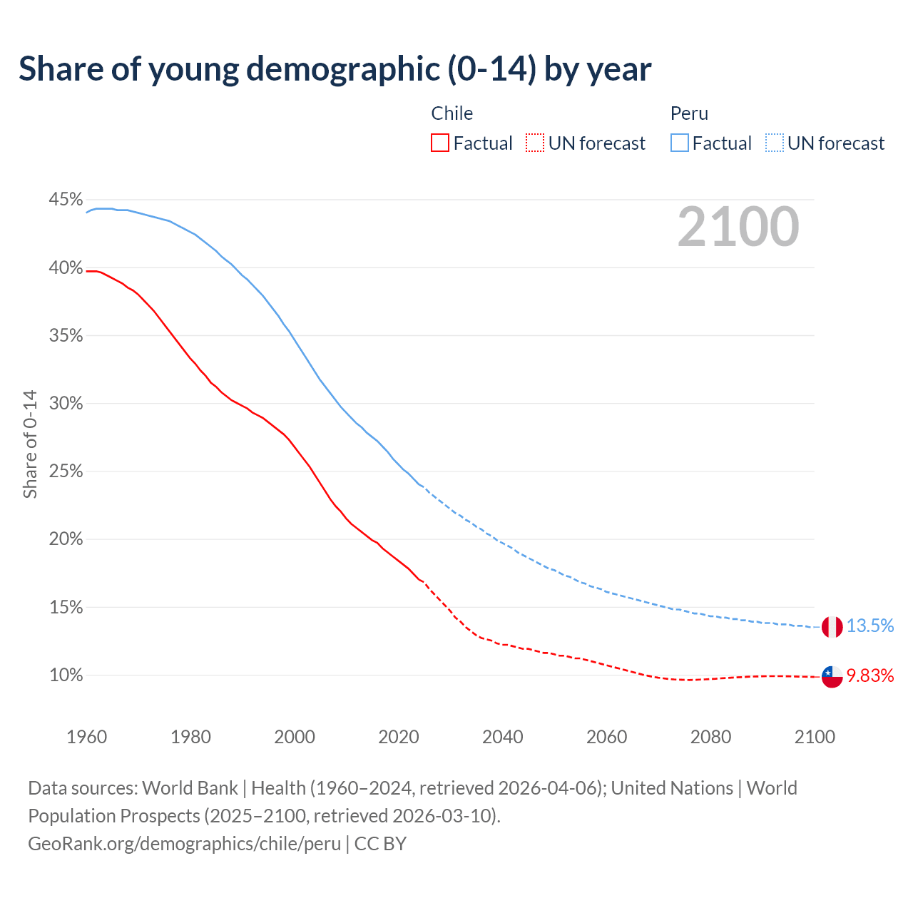 - The share of young demographic (0-15 years old) in Chile is 17% vs 24% in Peru.