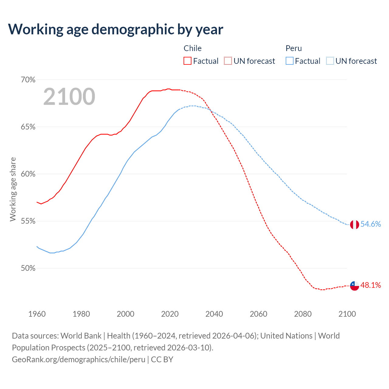 - Chile has 13.8M working age adults (aged 15-64) vs 23.4M in Peru.