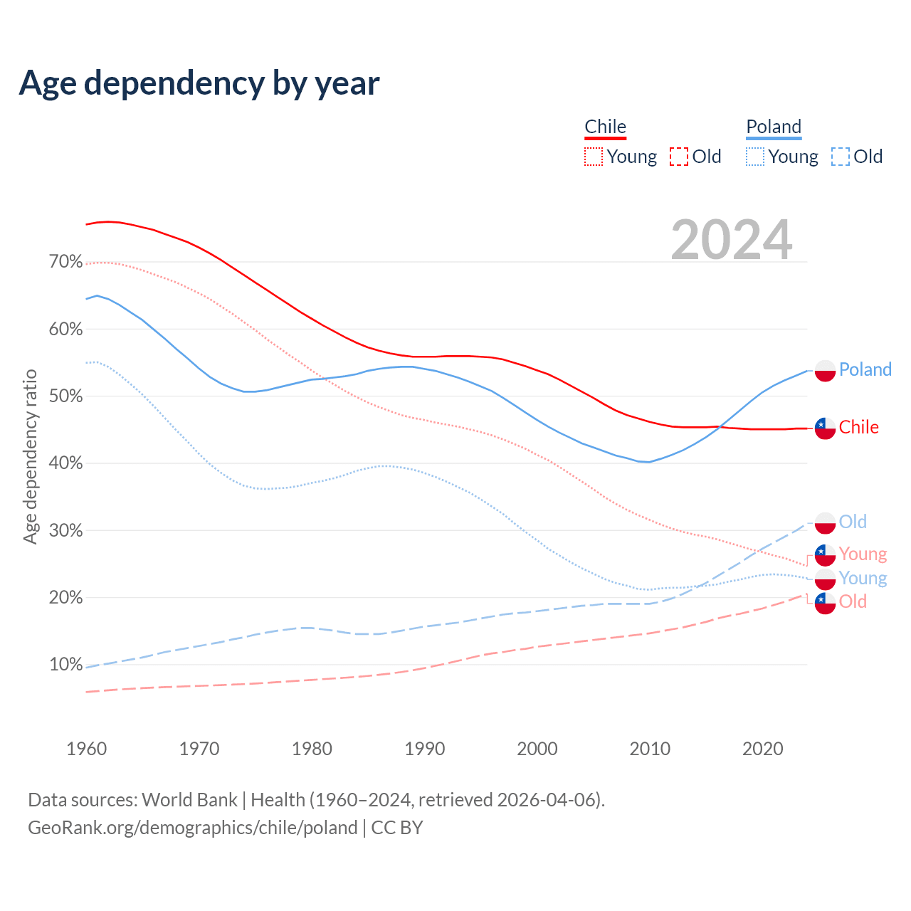 - Chile is ranked 61/196 by median age (oldest to youngest) vs 30/196 for Poland.