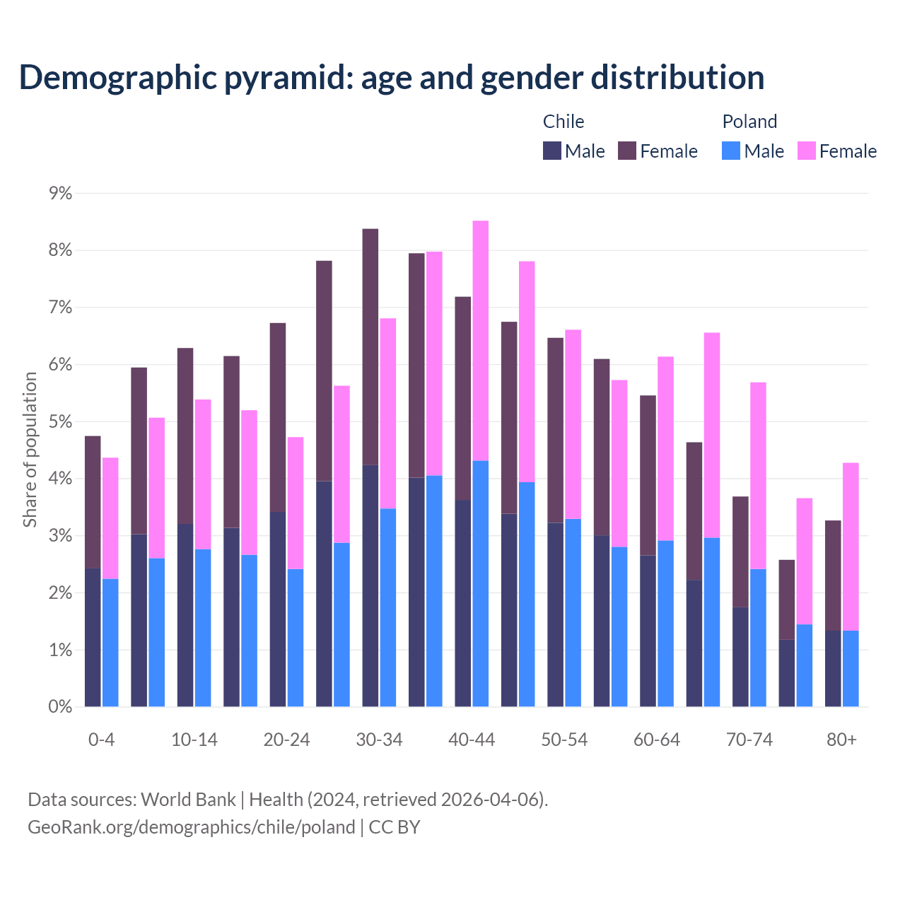 The share of older people aged 65 and over is 14.1% in Chile and 20.1% in Poland. Life expectancy in Chile compared to Poland .