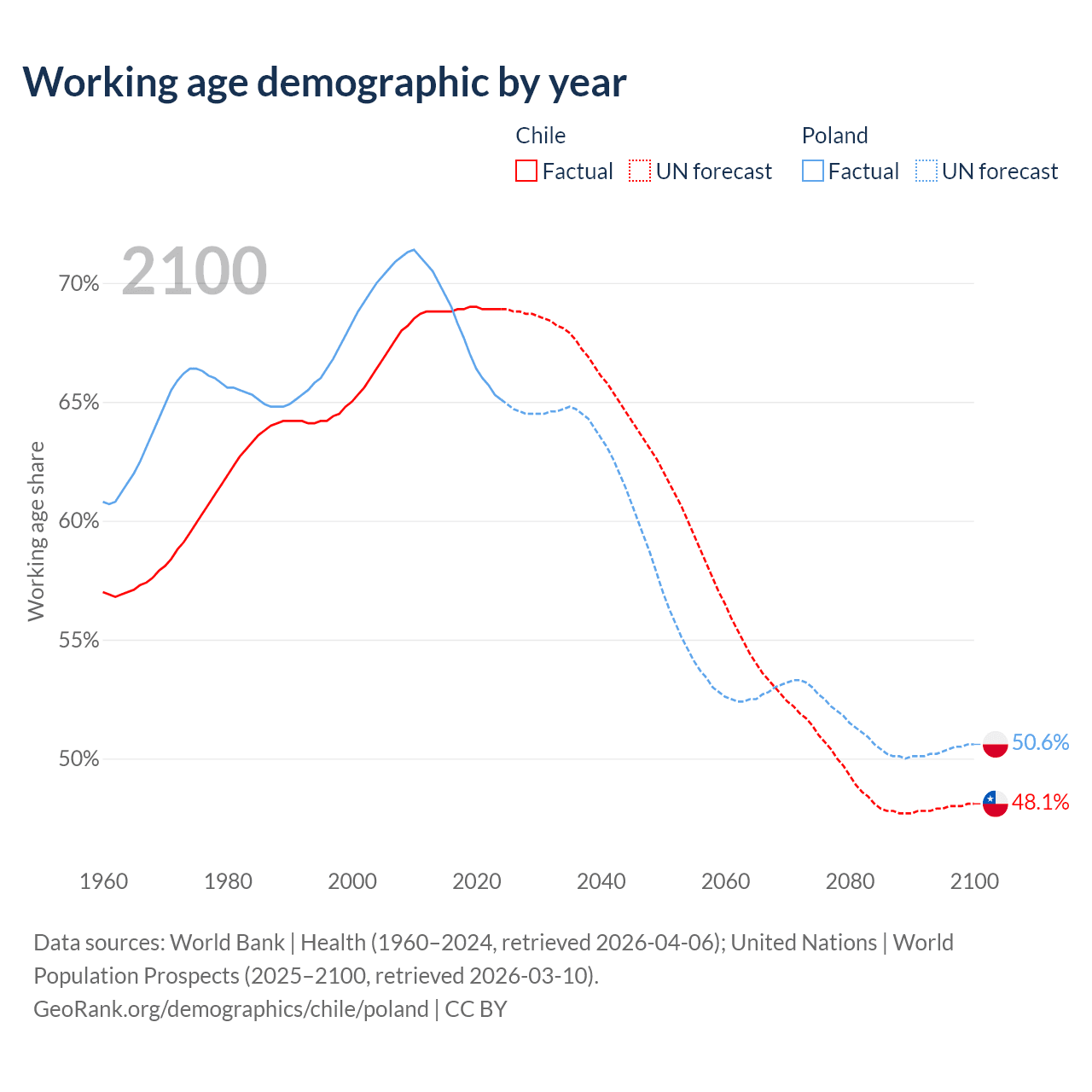 Median age Chile vs Poland, 1960-2100