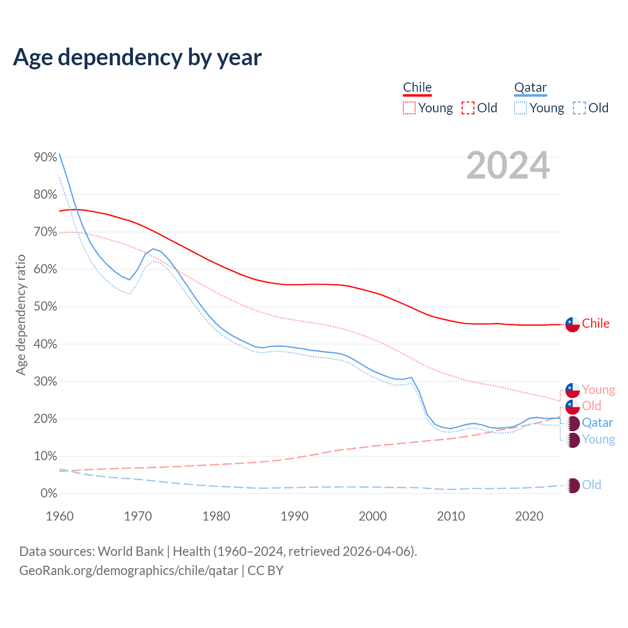 - Chile is ranked 61/196 by median age (oldest to youngest) vs 78/196 for Qatar.