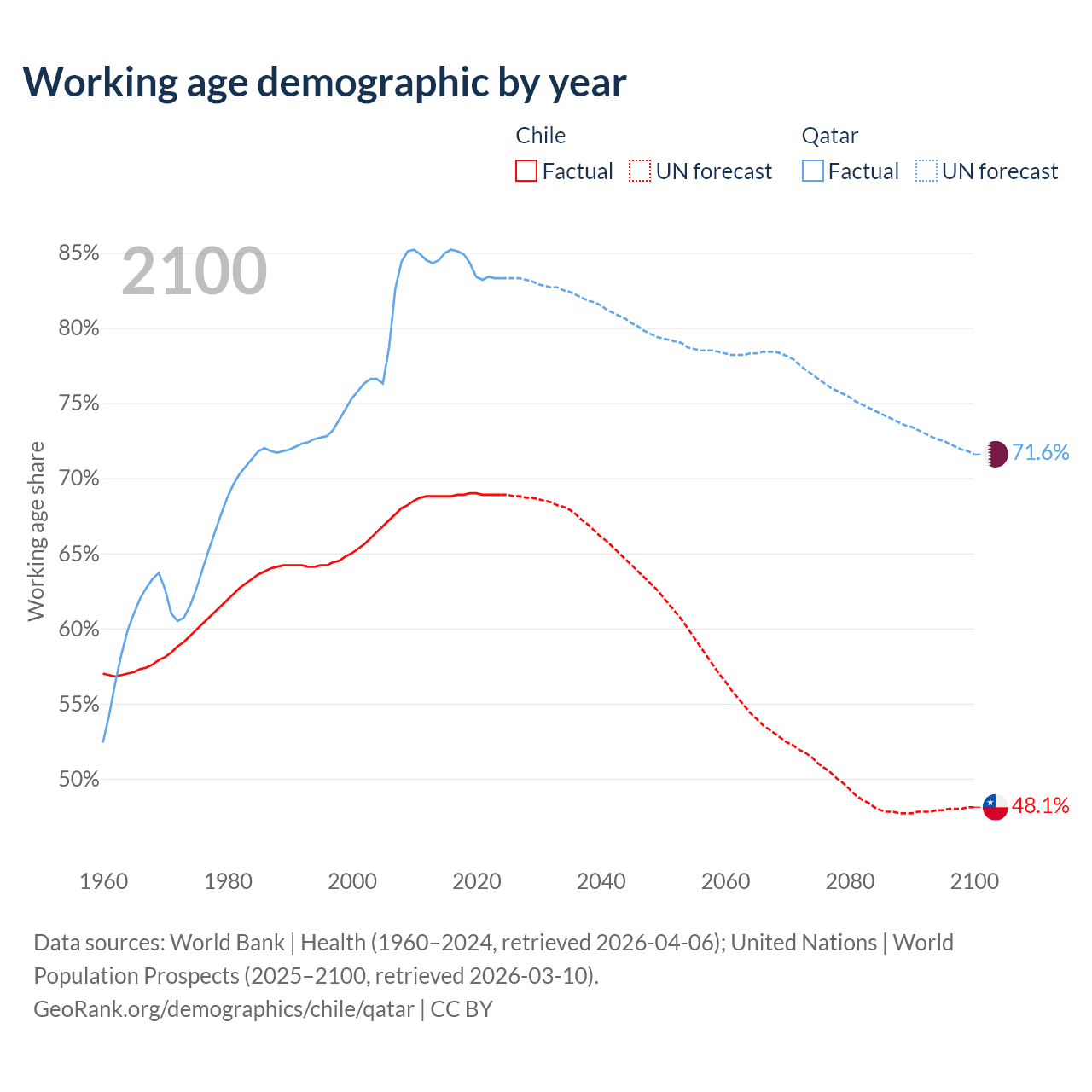 Median age Chile vs Qatar, 1960-2100