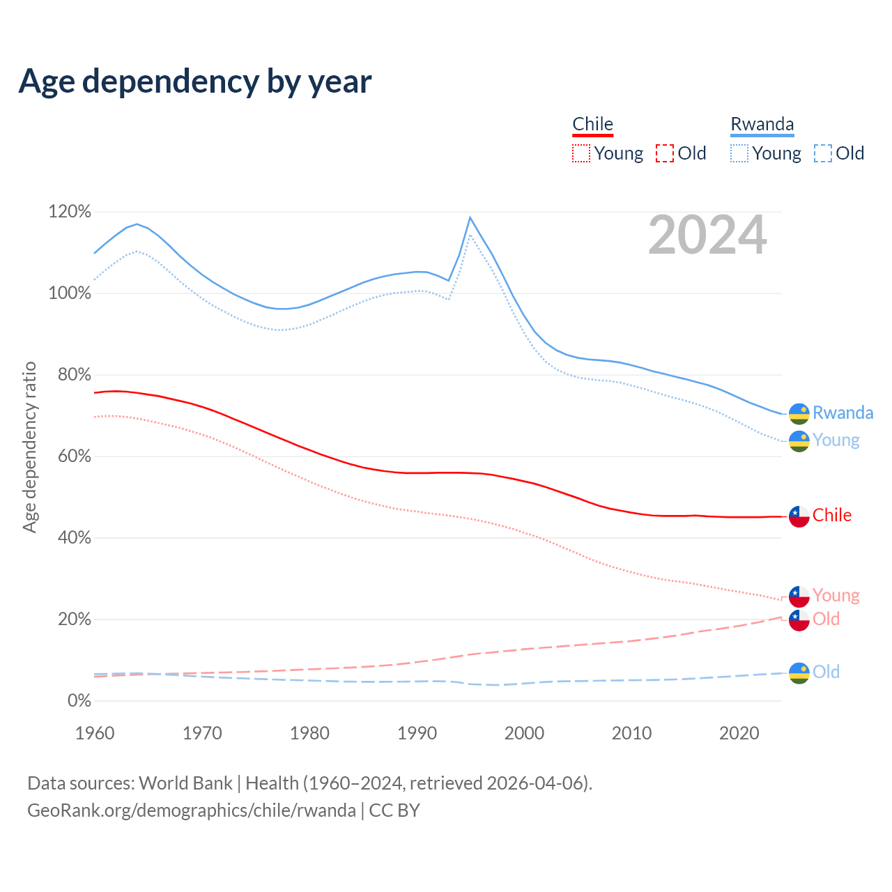 - The share of old-age demographic (65+) in Chile is 14.1% vs 3.93% in Rwanda.