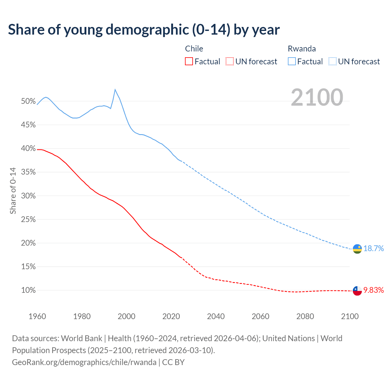 - The share of young demographic (0-15 years old) in Chile is 17% vs 37.4% in Rwanda.