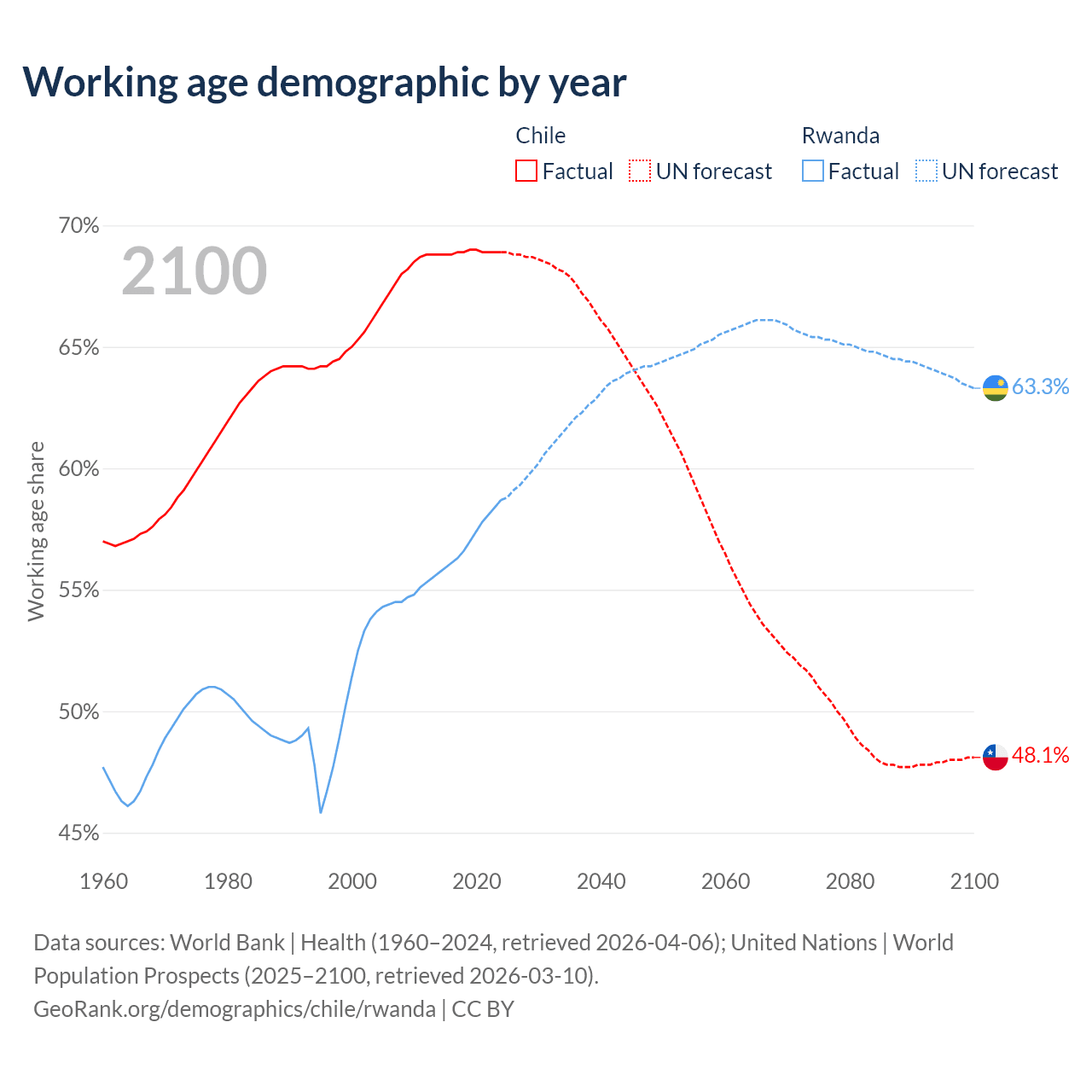 - Chile has 13.8M working age adults (aged 15-64) vs 8.79M in Rwanda.