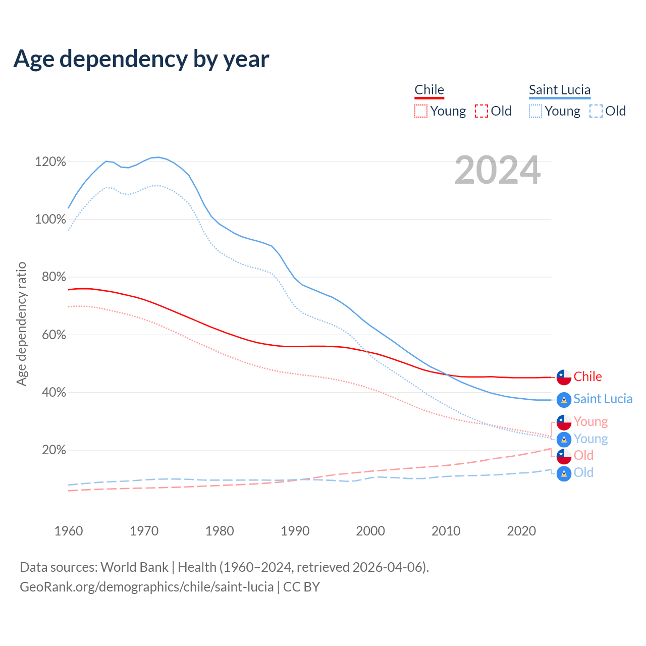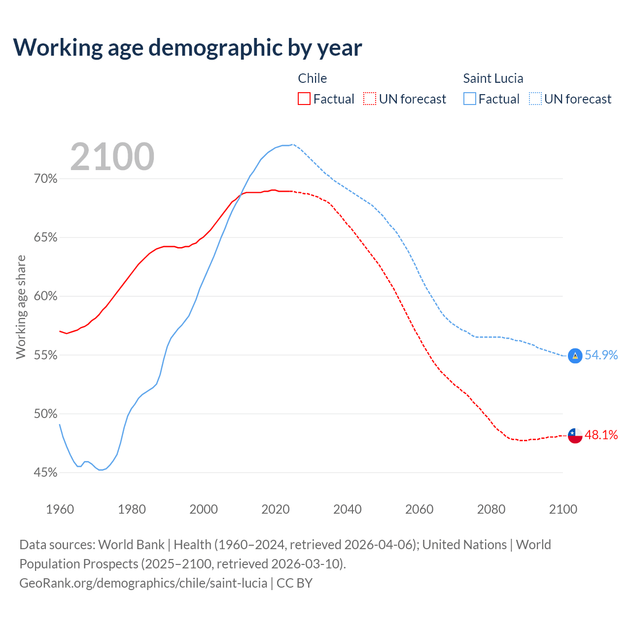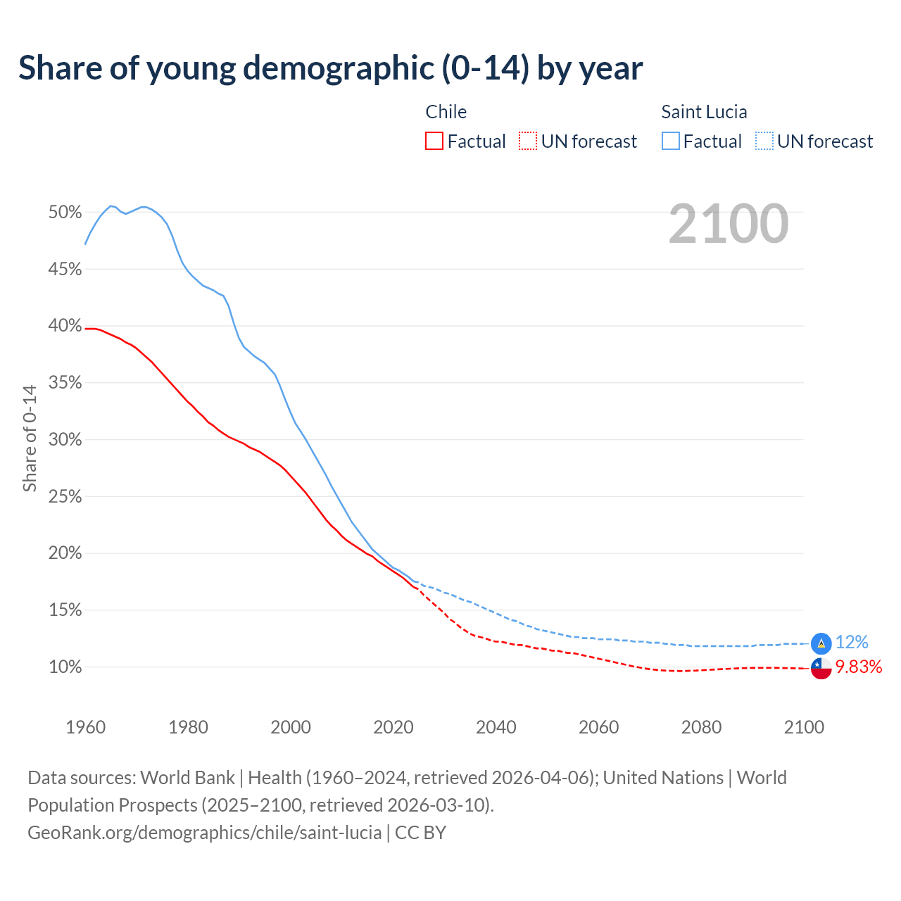 - The share of young demographic (0-15 years old) in Chile is 17% vs 17.5% in Saint Lucia.