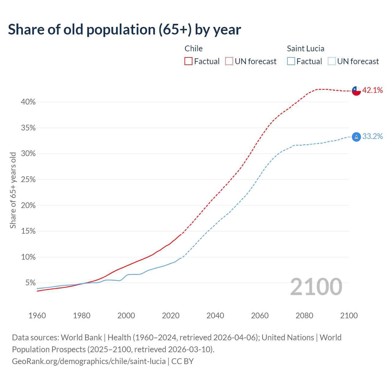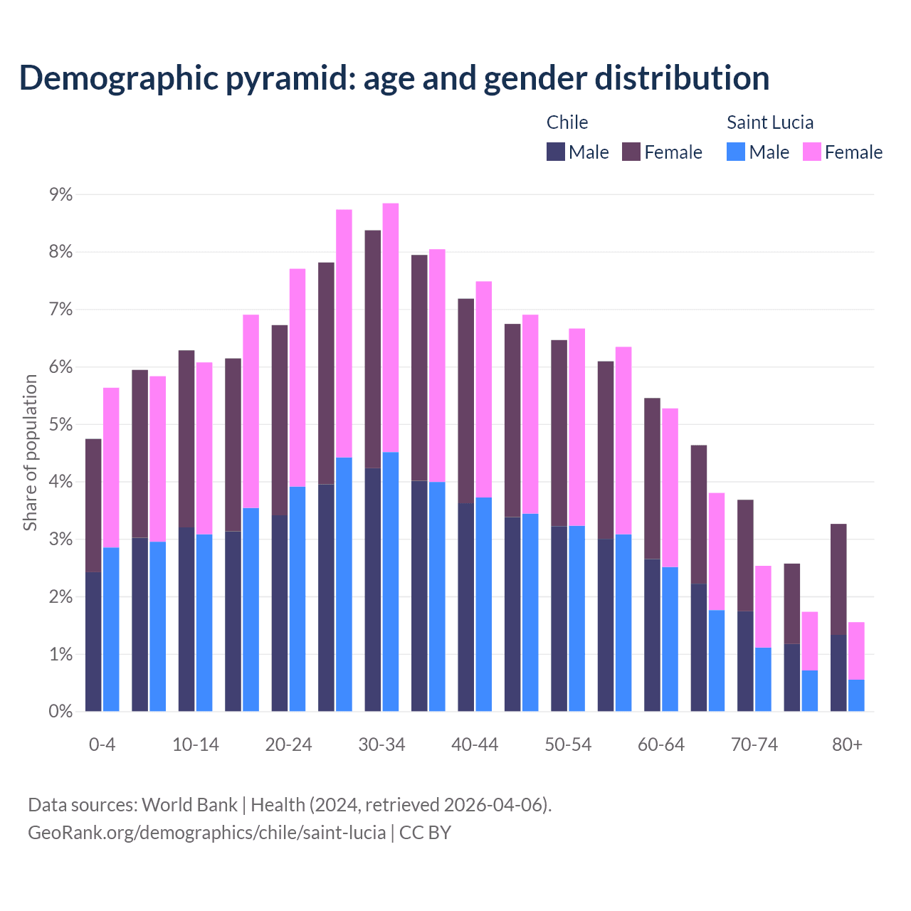 - The share of old-age demographic (65+) in Chile is 14.1% vs 9.62% in Saint Lucia.
