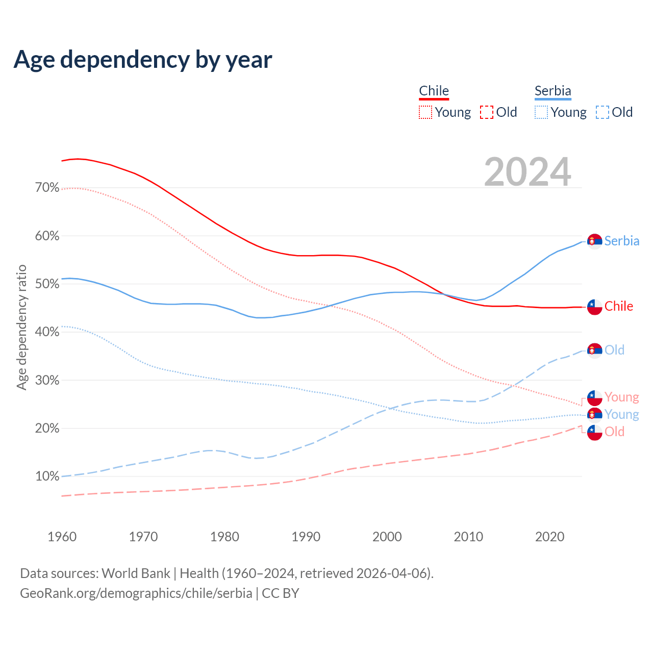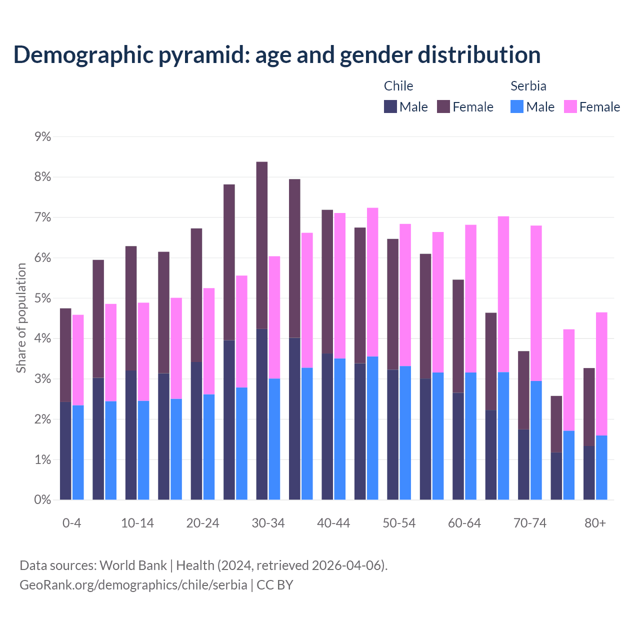 - Chile is ranked 61/196 by median age (oldest to youngest) vs 15/196 for Serbia.