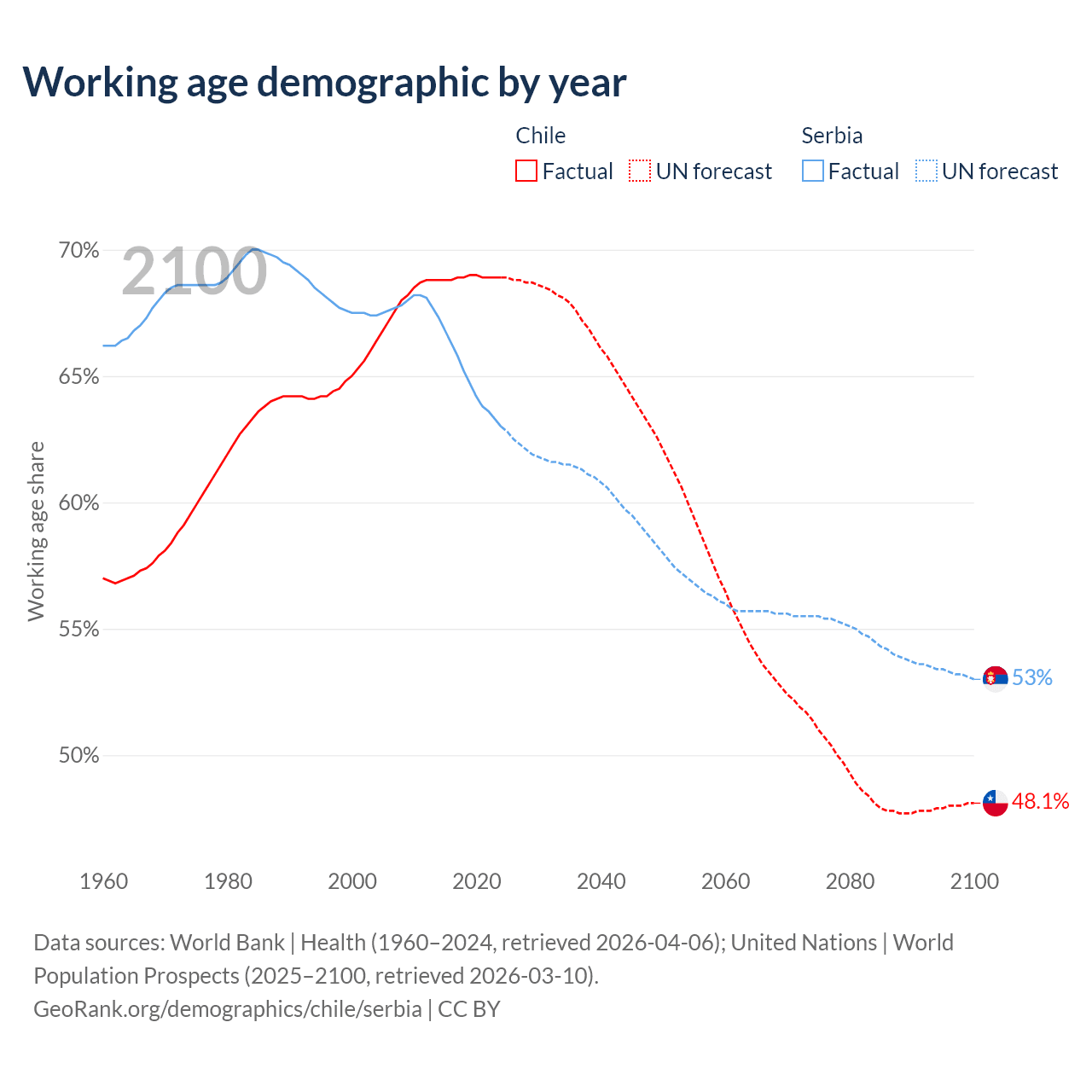 Median age Chile vs Serbia, 1960-2100