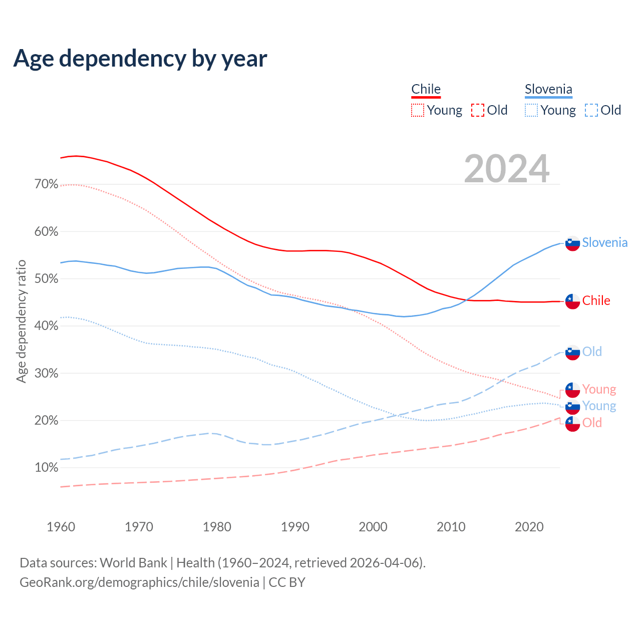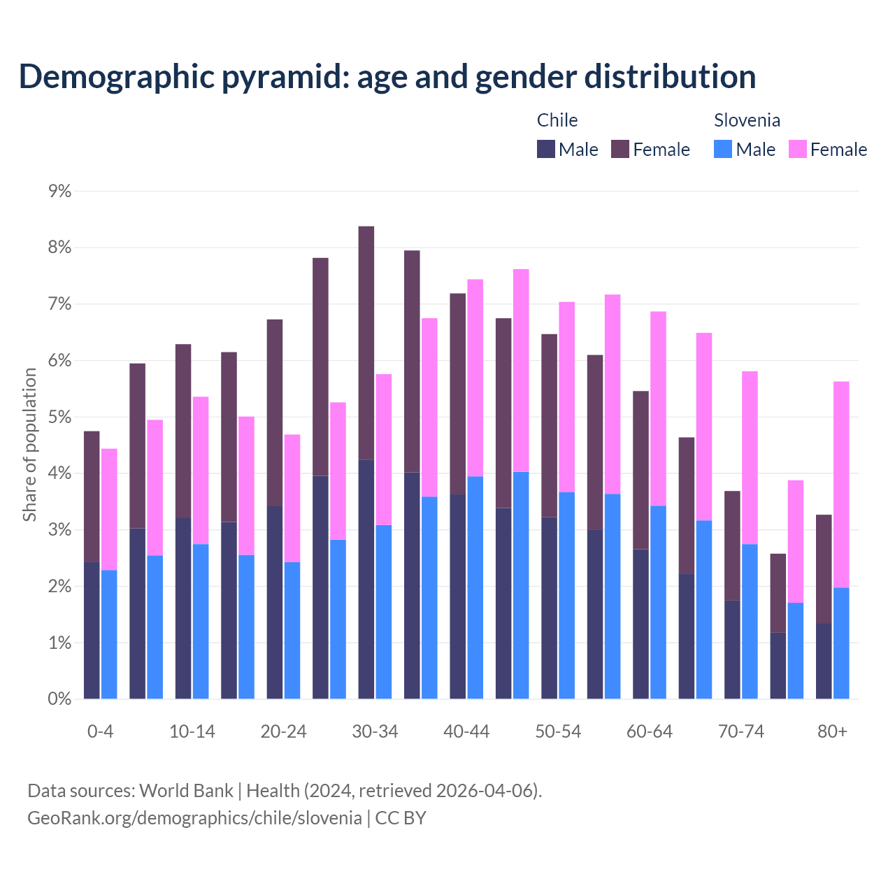 - Chile is ranked 61/196 by median age (oldest to youngest) vs 14/196 for Slovenia.