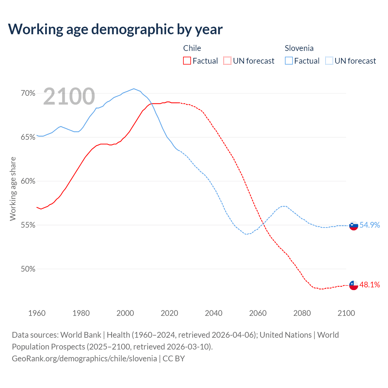 - Chile has 13.8M working age adults (aged 15-64) vs 1.35M in Slovenia.