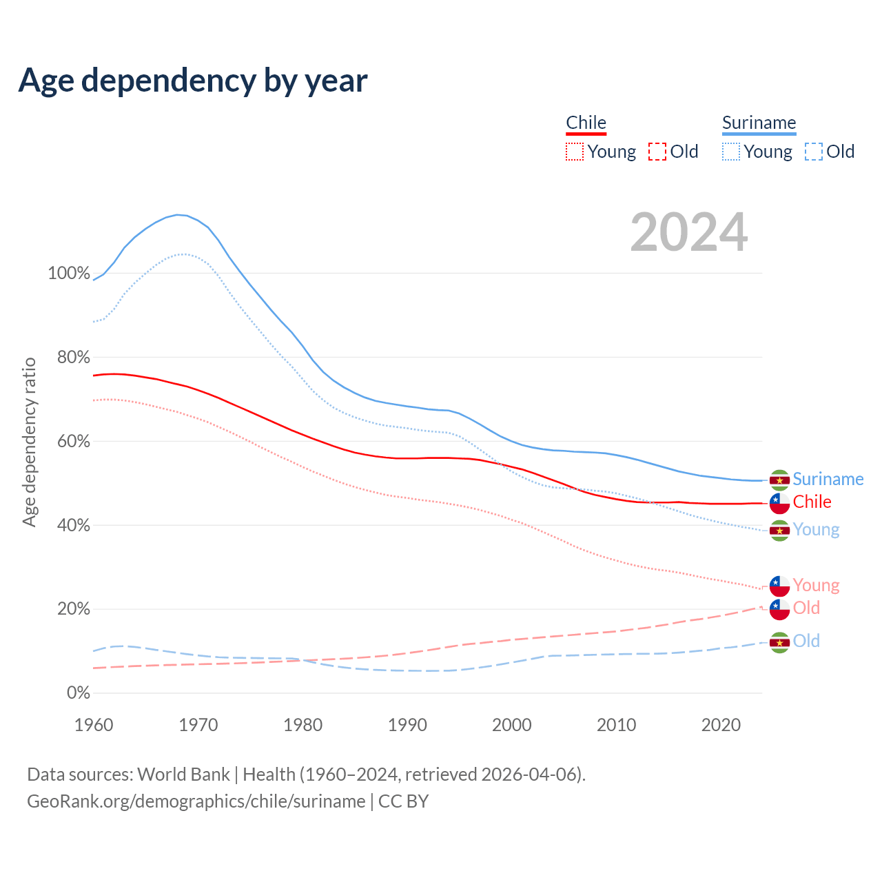 - The share of young demographic (0-15 years old) in Chile is 17% vs 25.6% in Suriname.