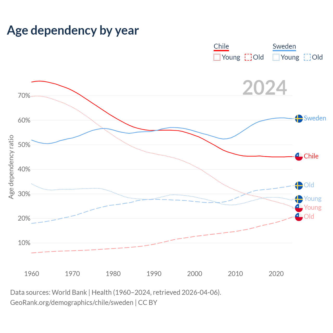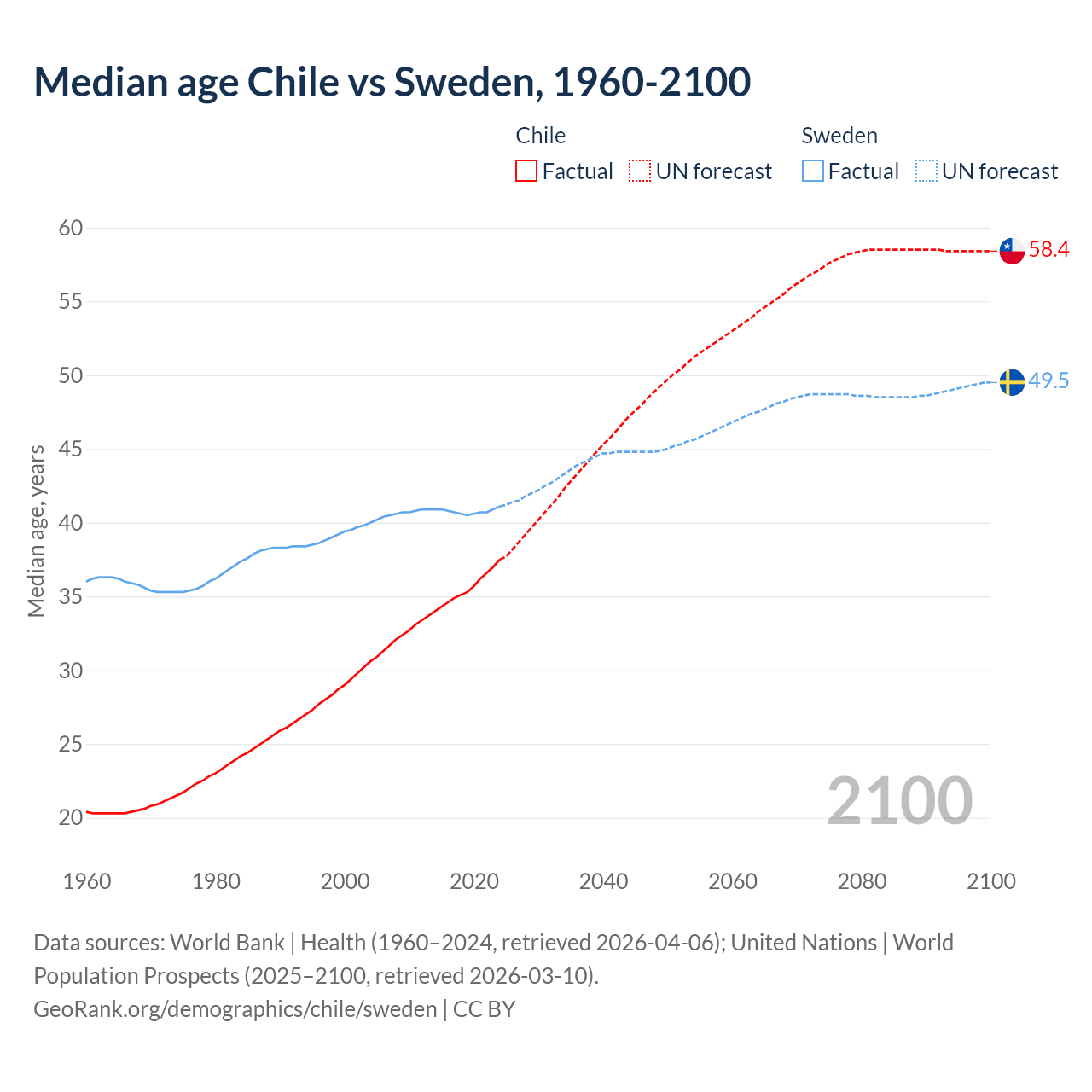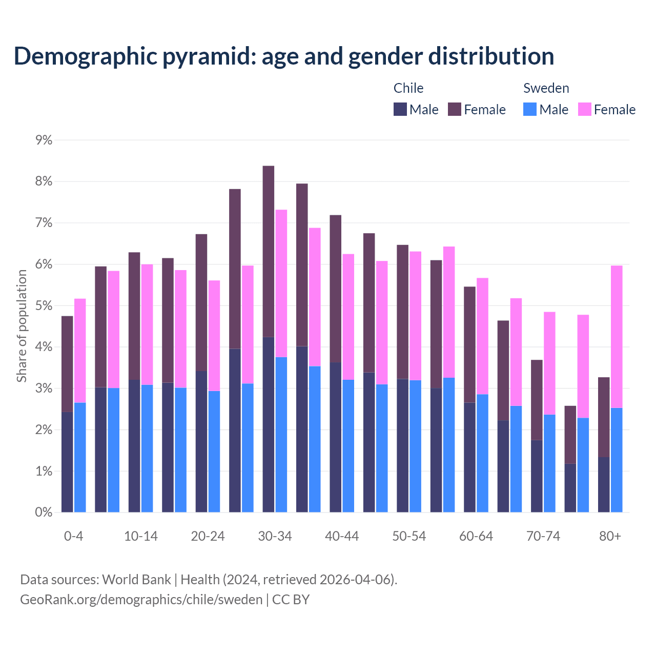 - Chile is ranked 61/196 by median age (oldest to youngest) vs 39/196 for Sweden.