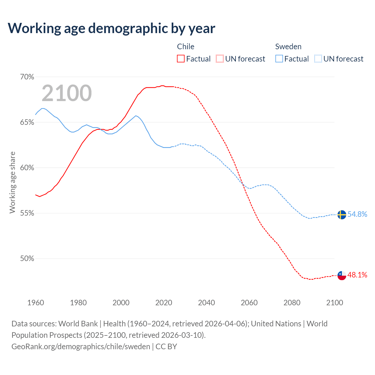- The share of young demographic (0-15 years old) in Chile is 17% vs 17% in Sweden.