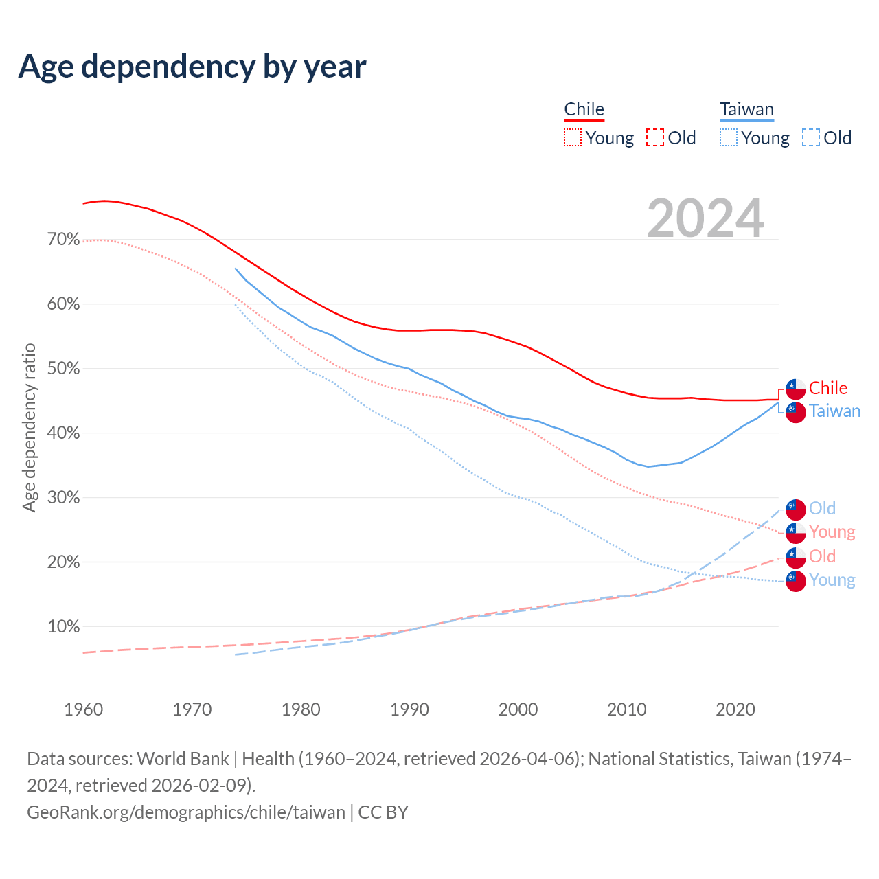 Data sources: World Bank | Health (1960–2024, retrieved 2026-04-06); U.S. Census Bureau (1960–2024, retrieved 2026-02-08); National Statistics, Taiwan (1974–2024, retrieved 2026-02-09).