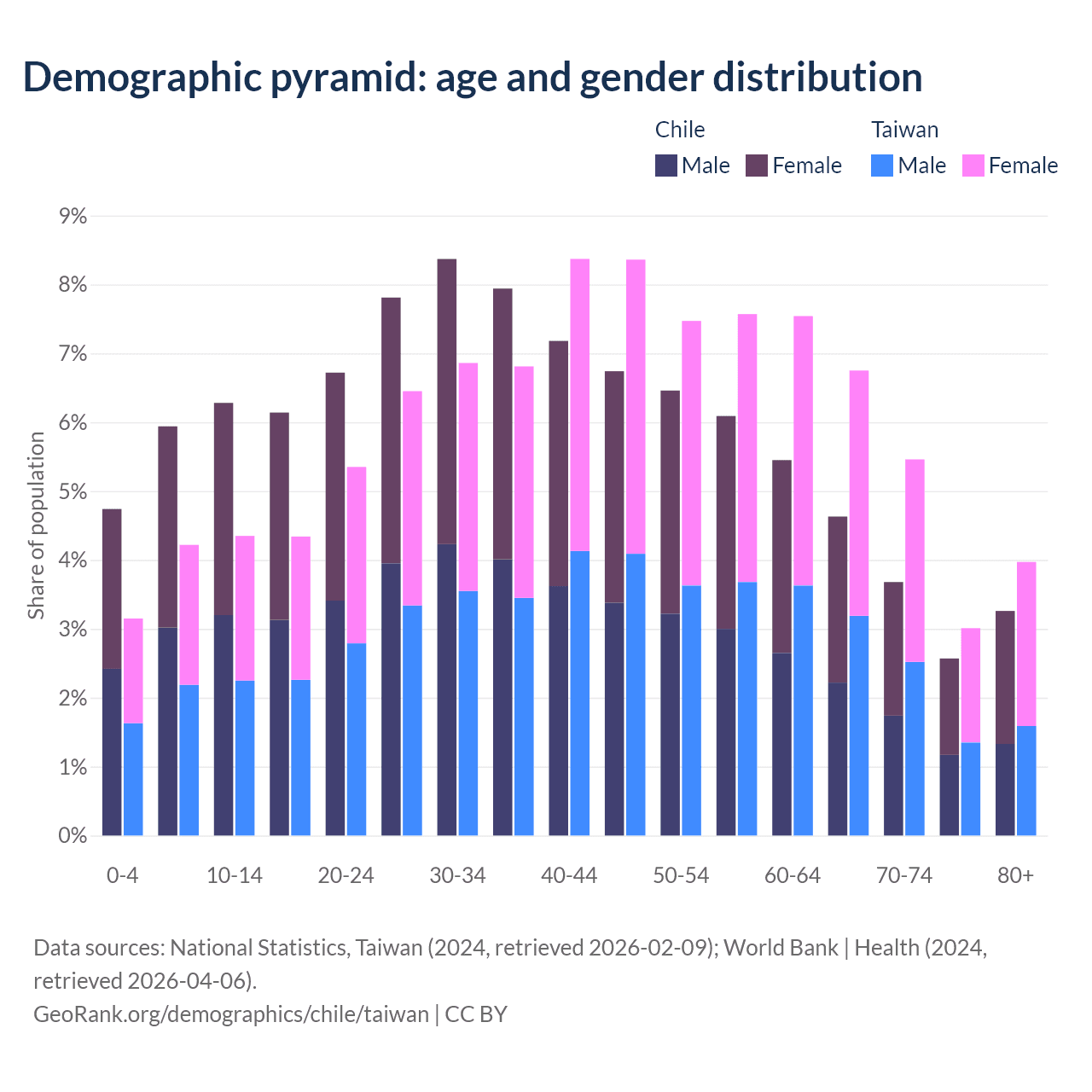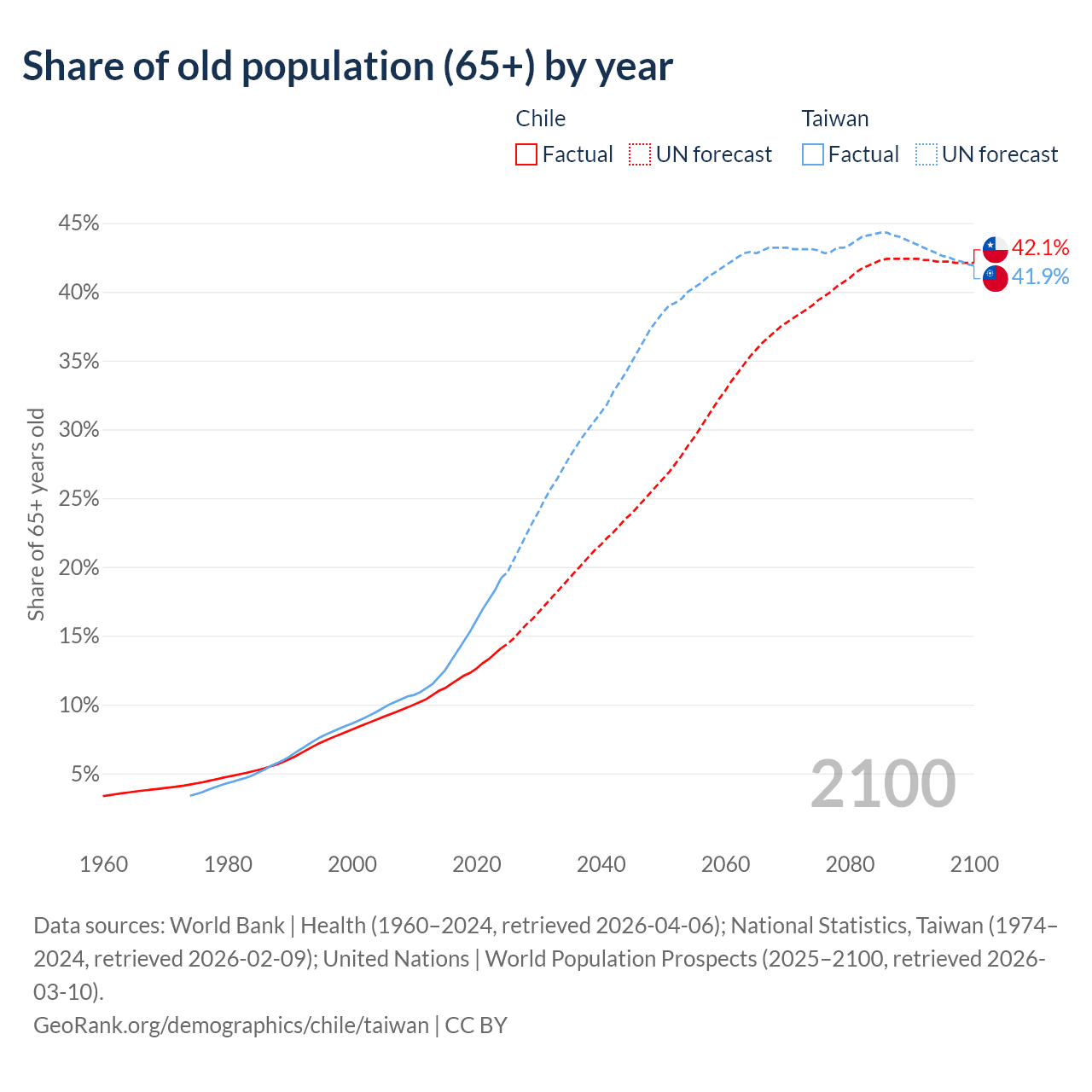 The share of older people aged 65 and over is 14.1% in Chile and 19.2% in Taiwan. Life expectancy in Chile compared to Taiwan .