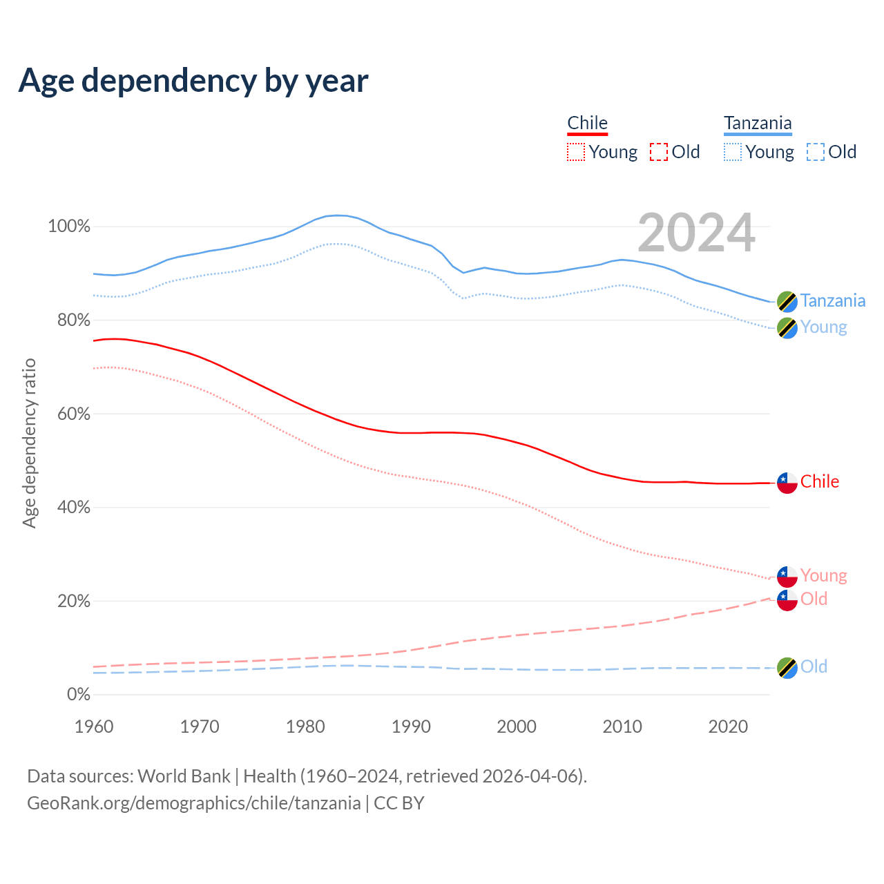 - The share of old-age demographic (65+) in Chile is 14.1% vs 3.05% in Tanzania.