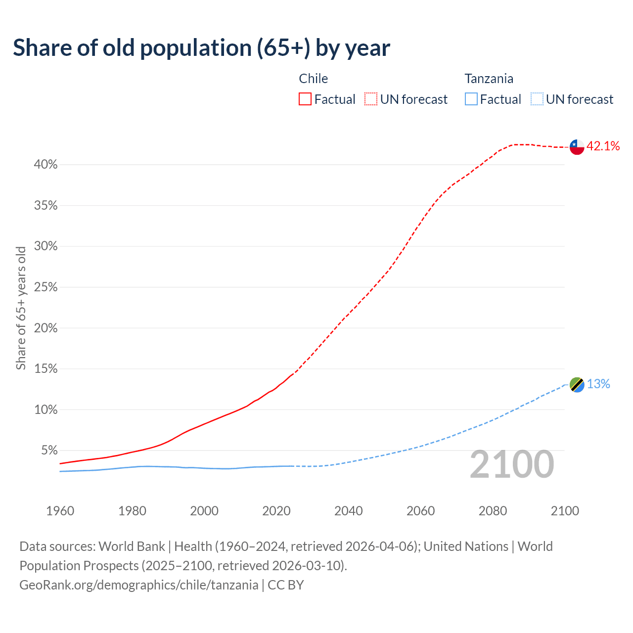 The share of older people aged 65 and over is 14.1% in Chile and 3.05% in Tanzania. Life expectancy in Chile compared to Tanzania .