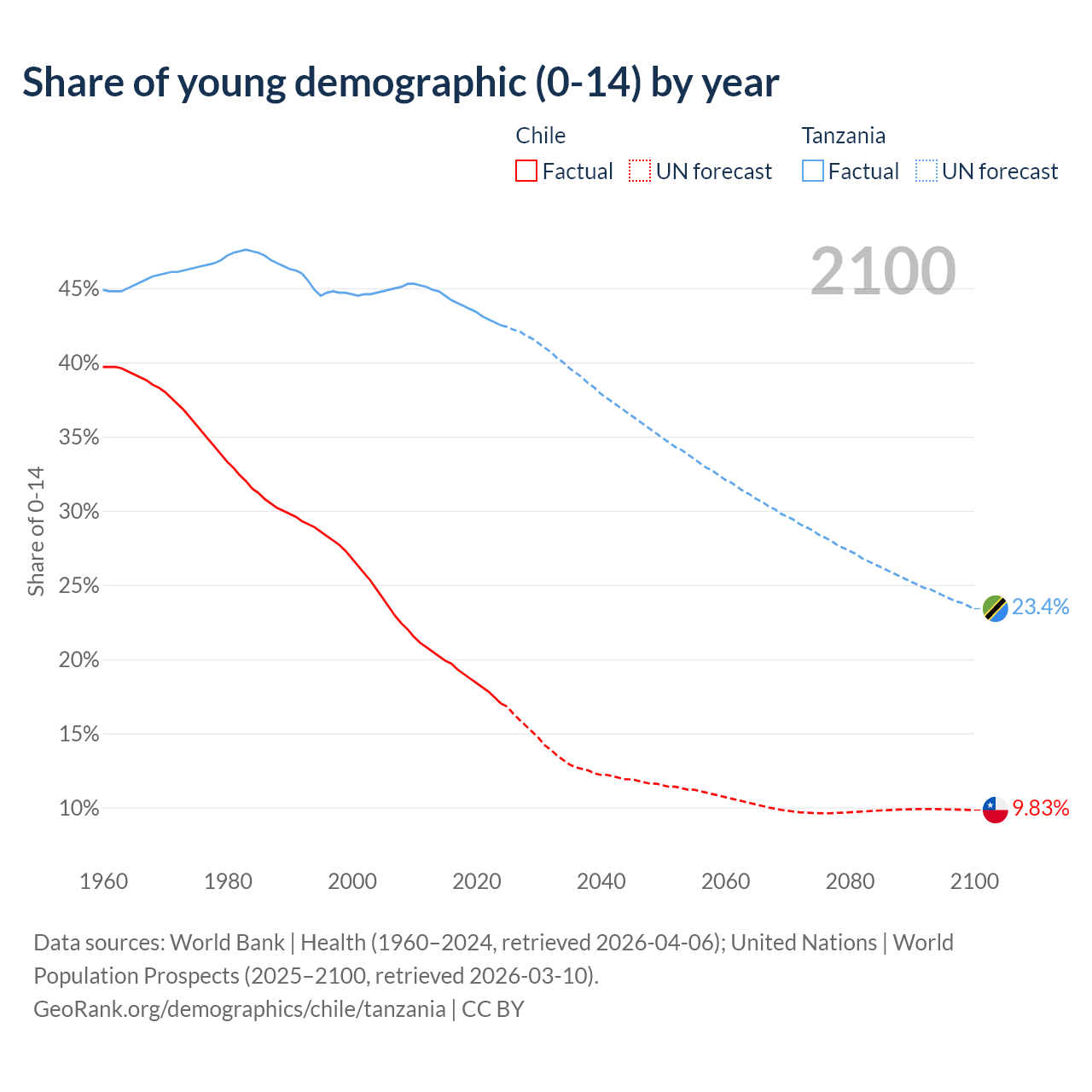 - The share of young demographic (0-15 years old) in Chile is 17% vs 42.5% in Tanzania.