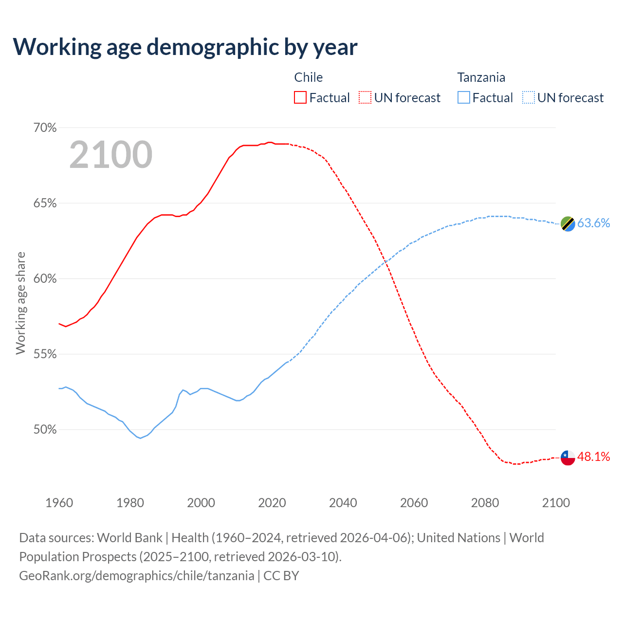 - Chile has 13.8M working age adults (aged 15-64) vs 39.8M in Tanzania.