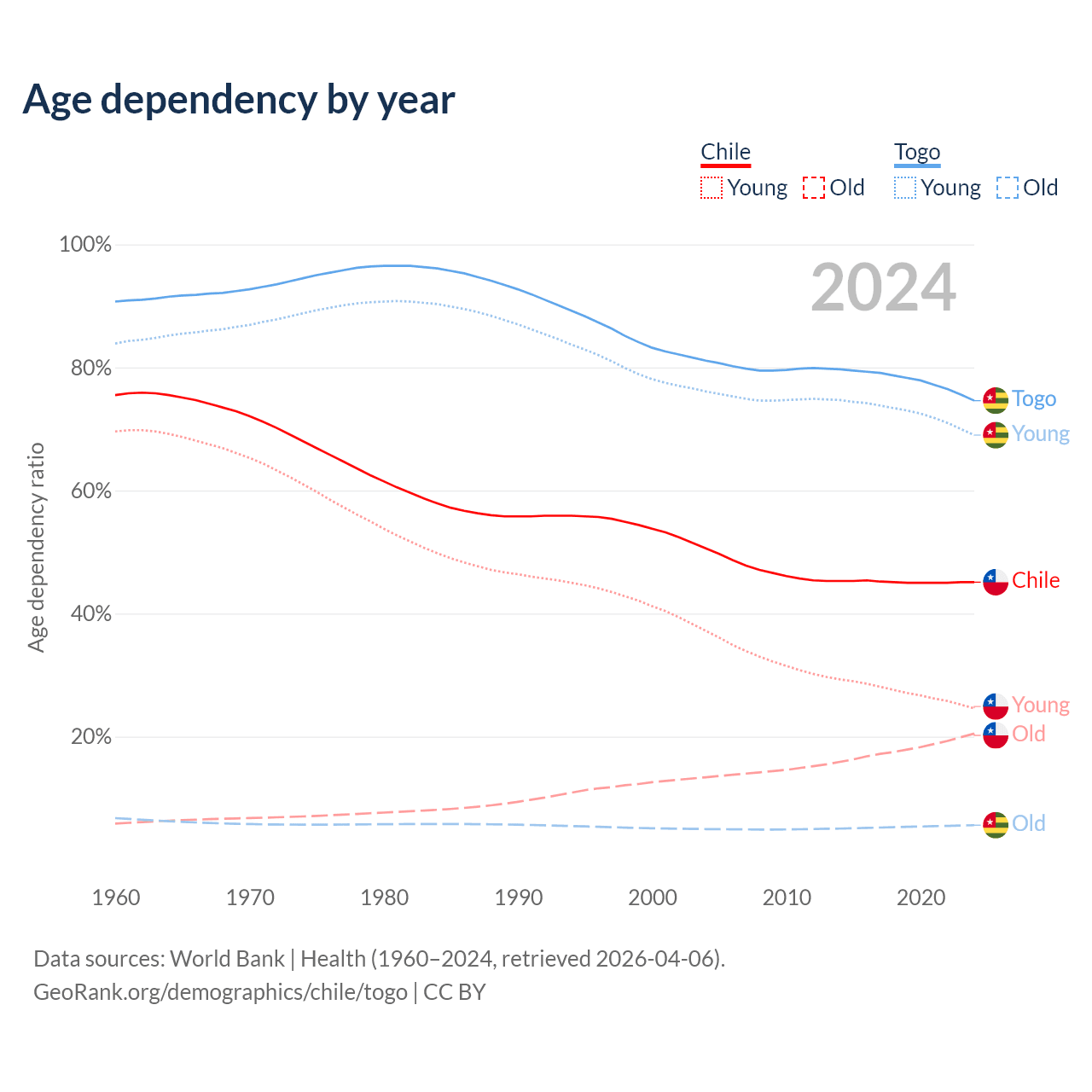 - The share of old-age demographic (65+) in Chile is 14.1% vs 3.21% in Togo.