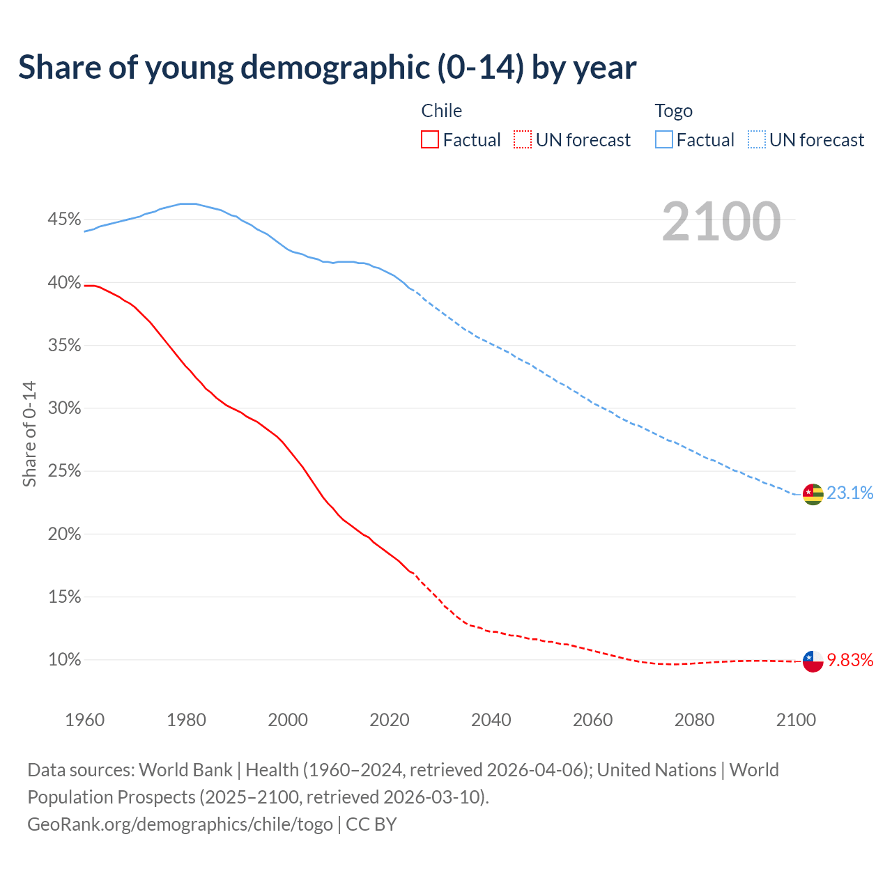 - The share of young demographic (0-15 years old) in Chile is 17% vs 39.5% in Togo.