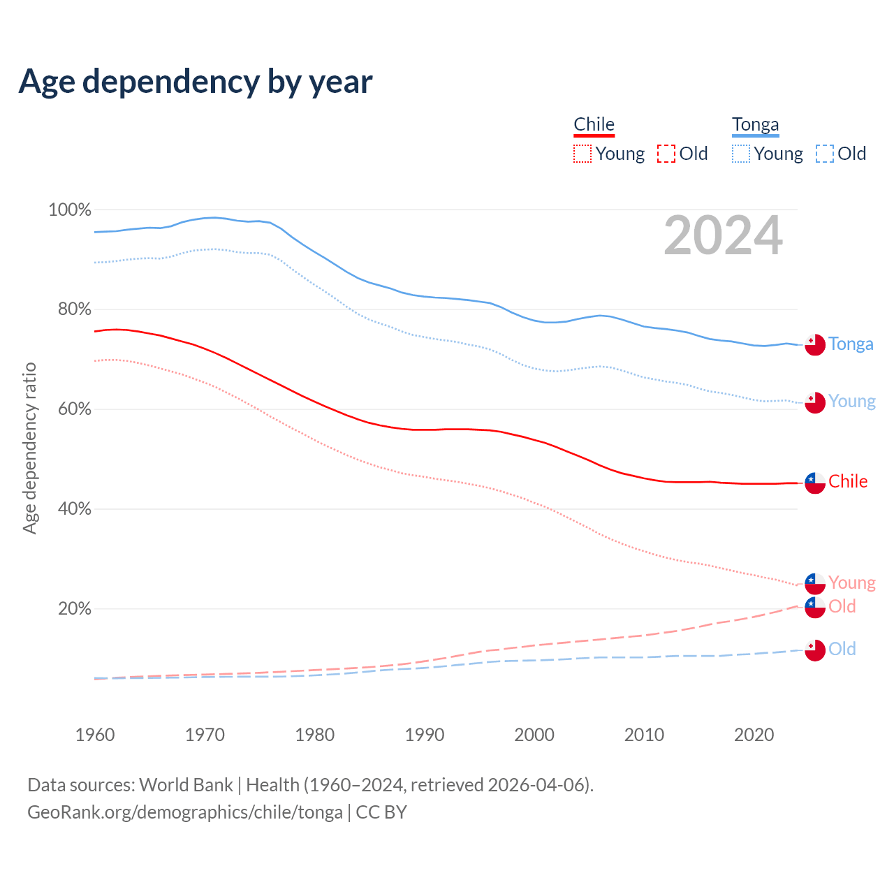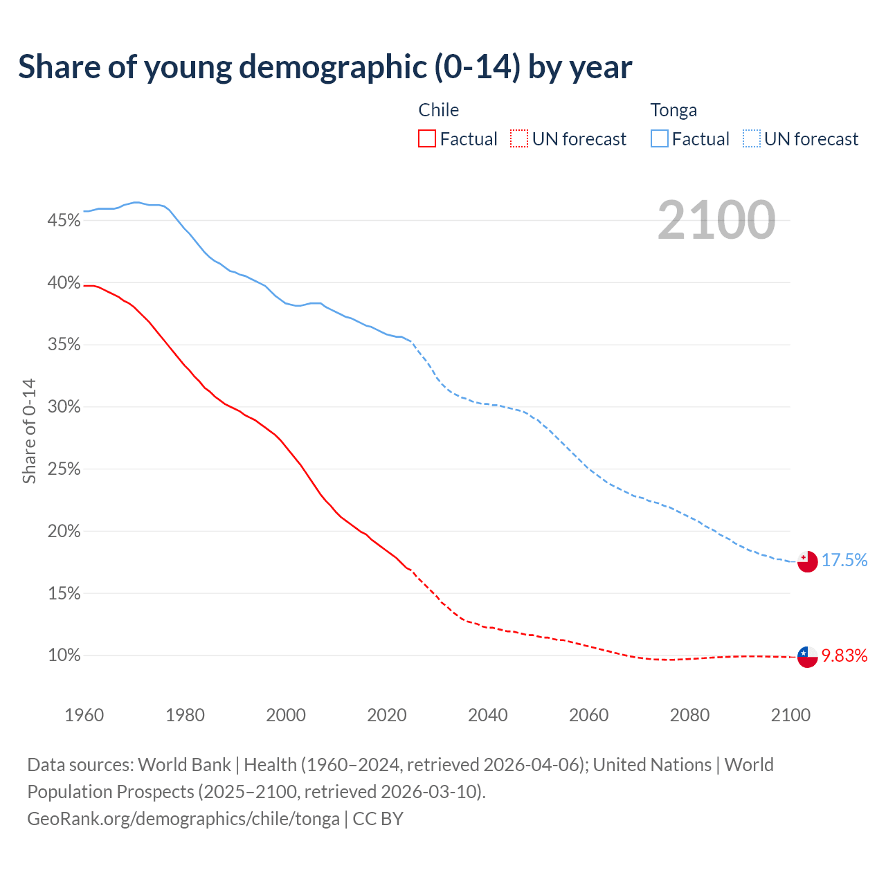 - The share of young demographic (0-15 years old) in Chile is 17% vs 35.4% in Tonga.