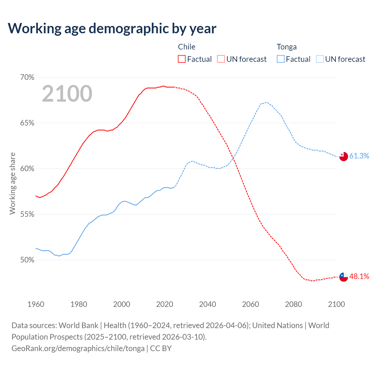 - Chile has 13.8M working age adults (aged 15-64) vs 59.8K in Tonga.