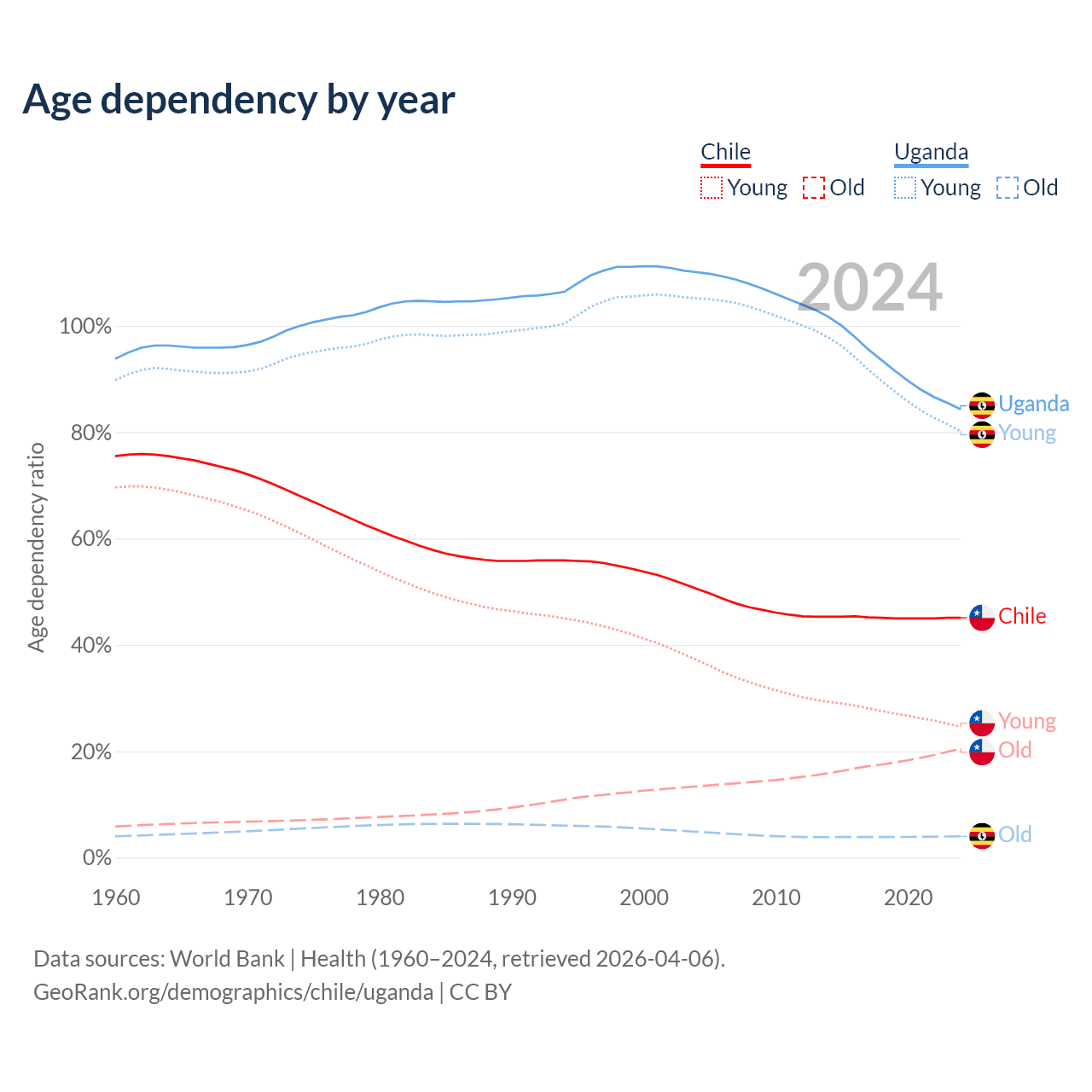 - The share of old-age demographic (65+) in Chile is 14.1% vs 2.19% in Uganda.