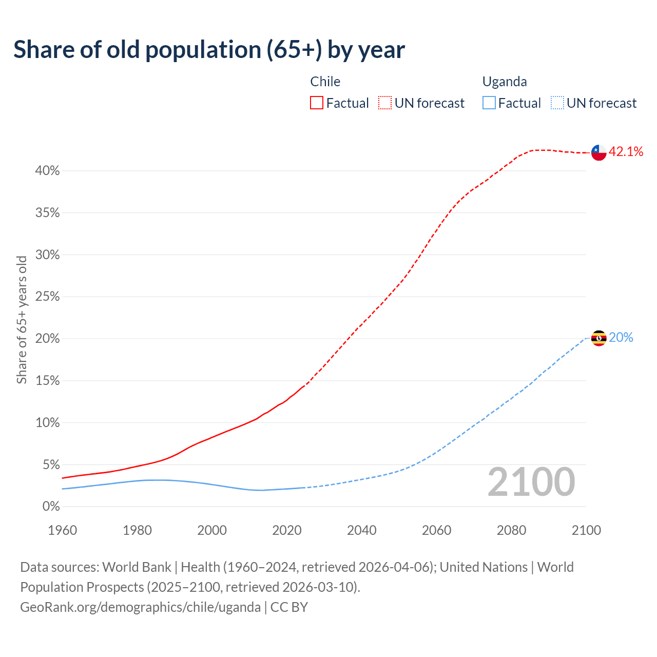 The share of older people aged 65 and over is 14.1% in Chile and 2.19% in Uganda. Life expectancy in Chile compared to Uganda .