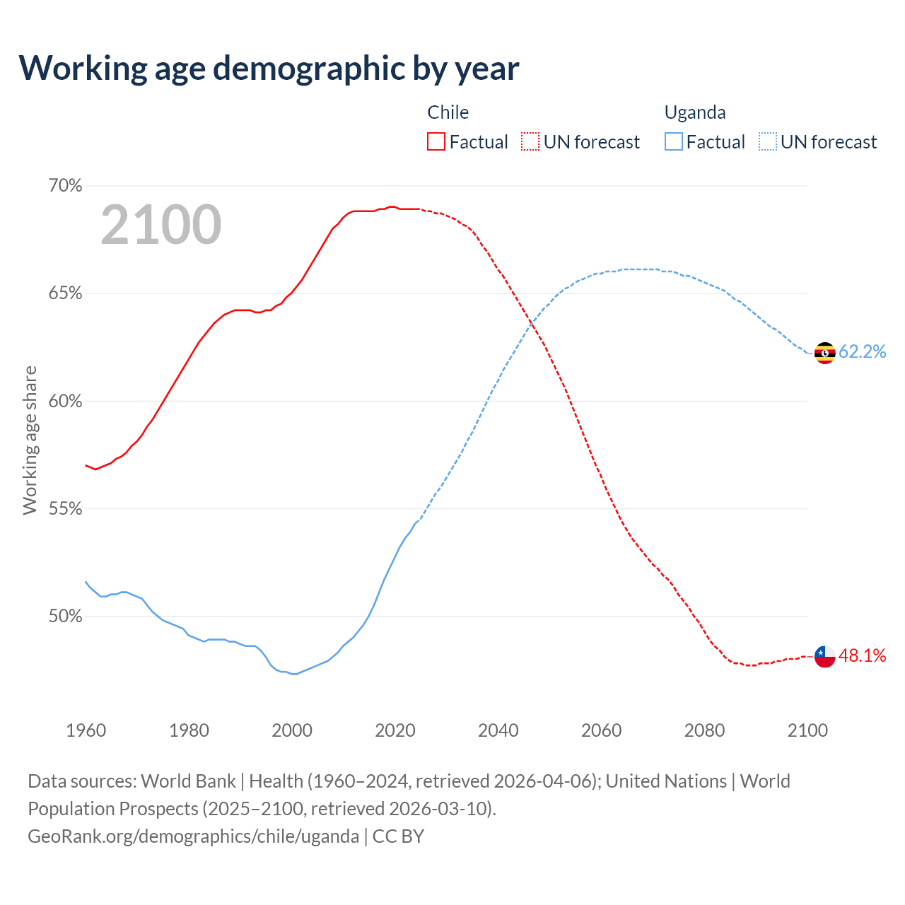Median age Chile vs Uganda, 1960-2100