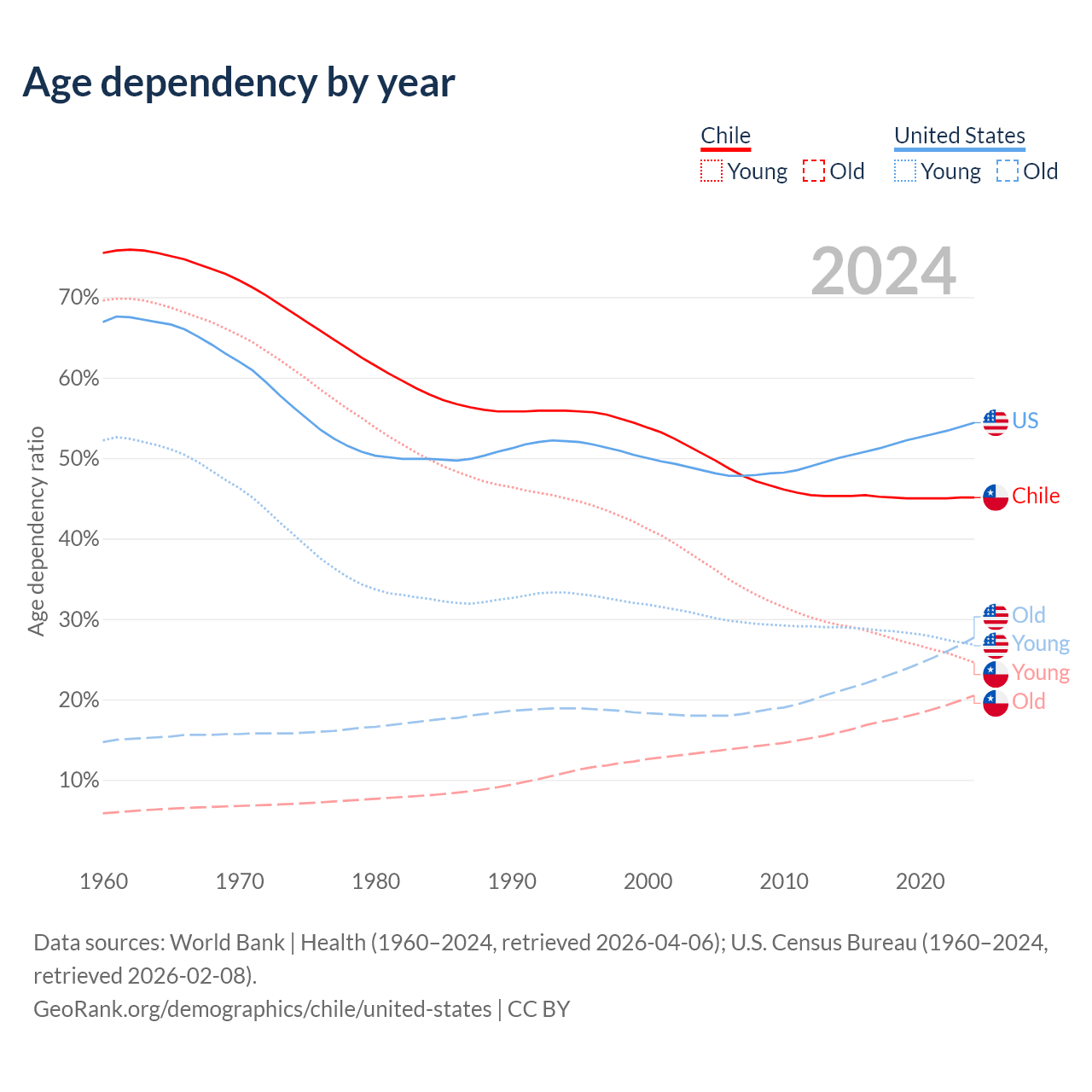- Chile is ranked 61/196 by median age (oldest to youngest) vs 50/196 for the United States.