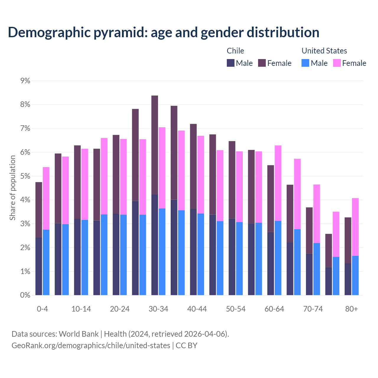 The share of older people aged 65 and over is 14.1% in Chile and 17.9% in the United States. Life expectancy in Chile compared to the United States .