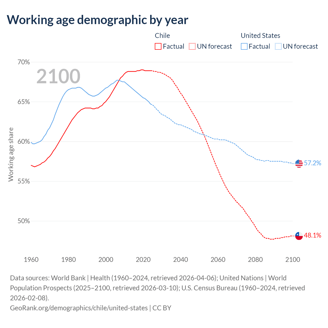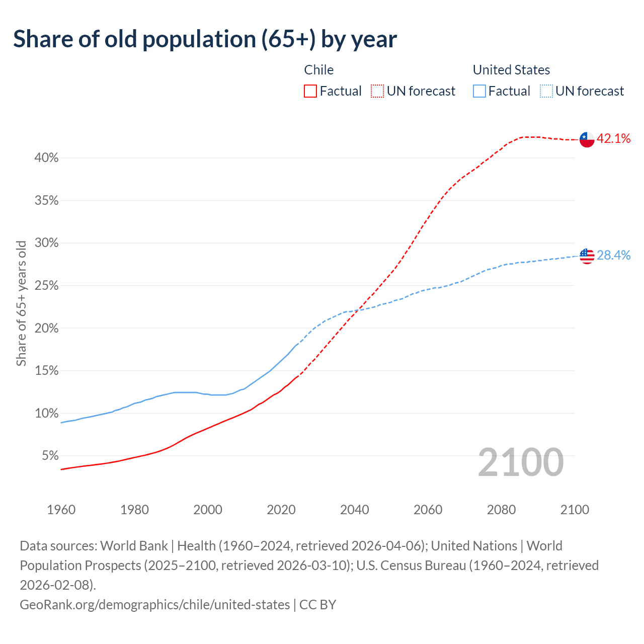 Median age Chile vs United States, 1960-2100