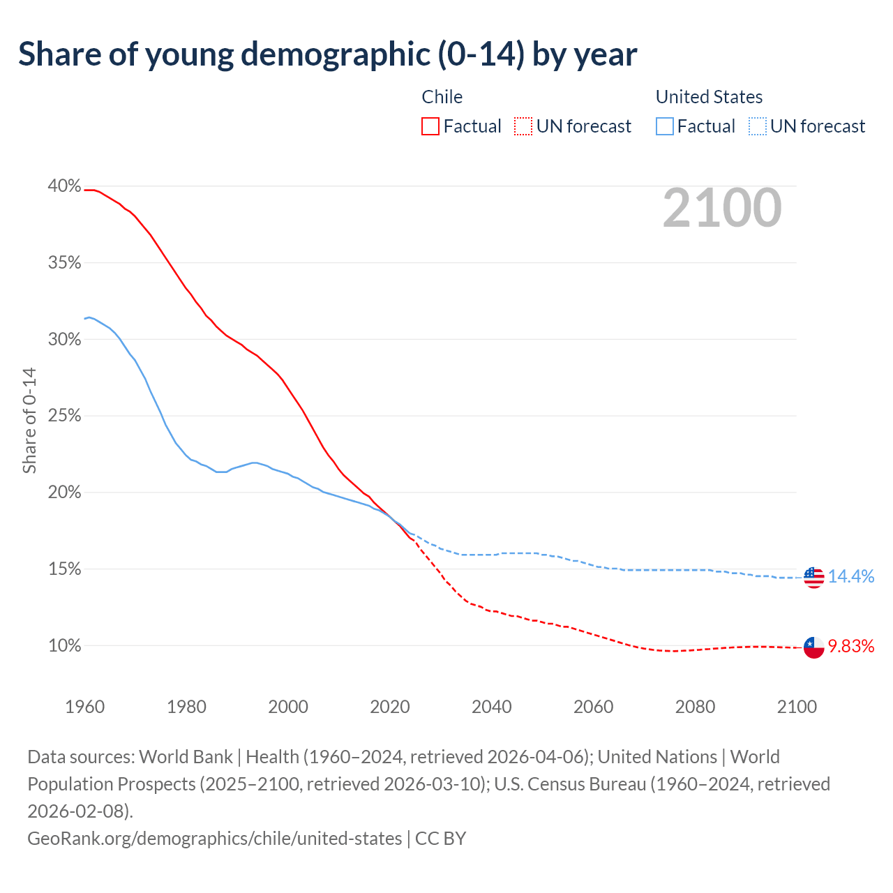 - The share of young demographic (0-15 years old) in Chile is 17% vs 17.3% in the United States.