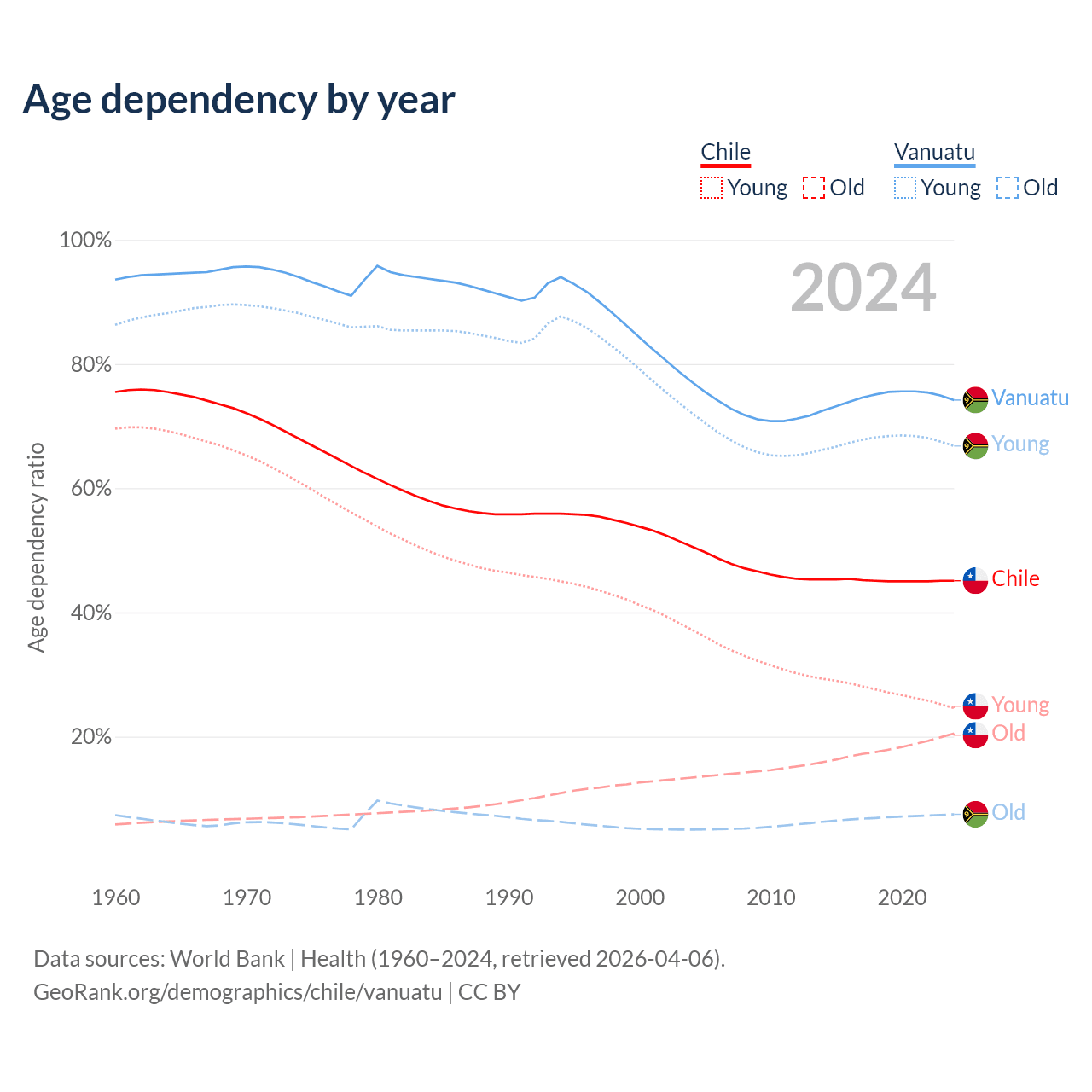 - The share of old-age demographic (65+) in Chile is 14.1% vs 4.3% in Vanuatu.