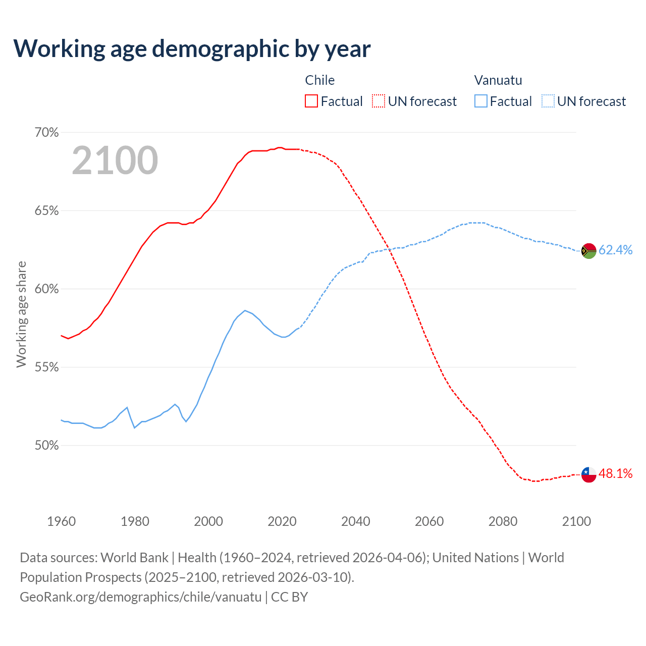 Median age Chile vs Vanuatu, 1960-2100
