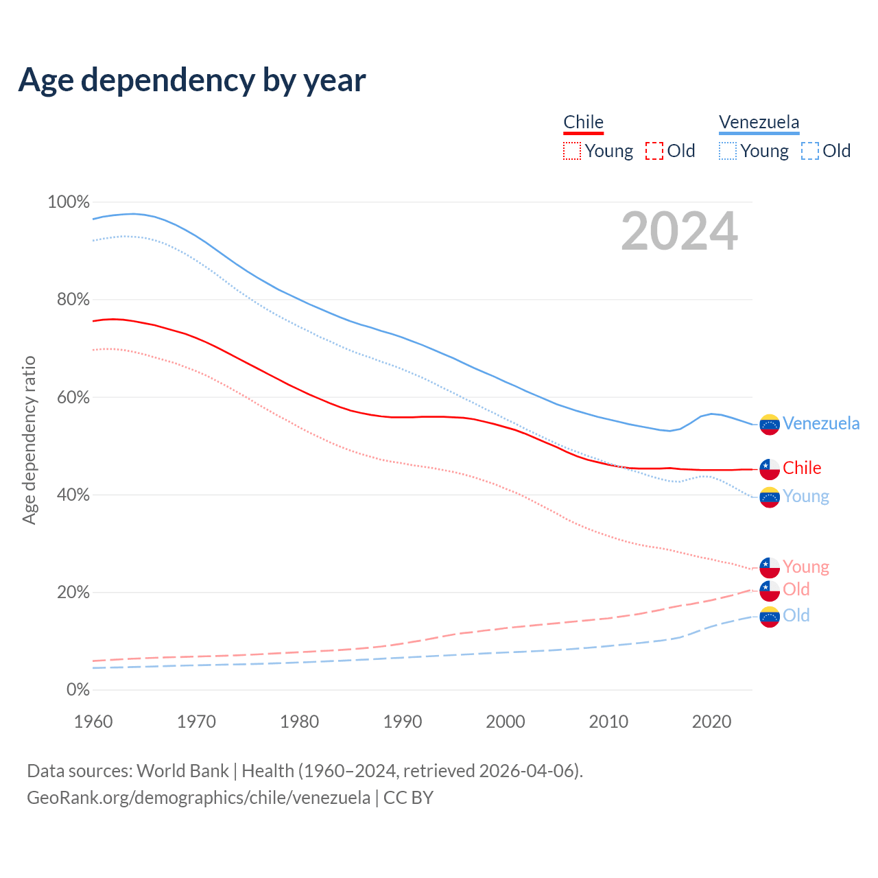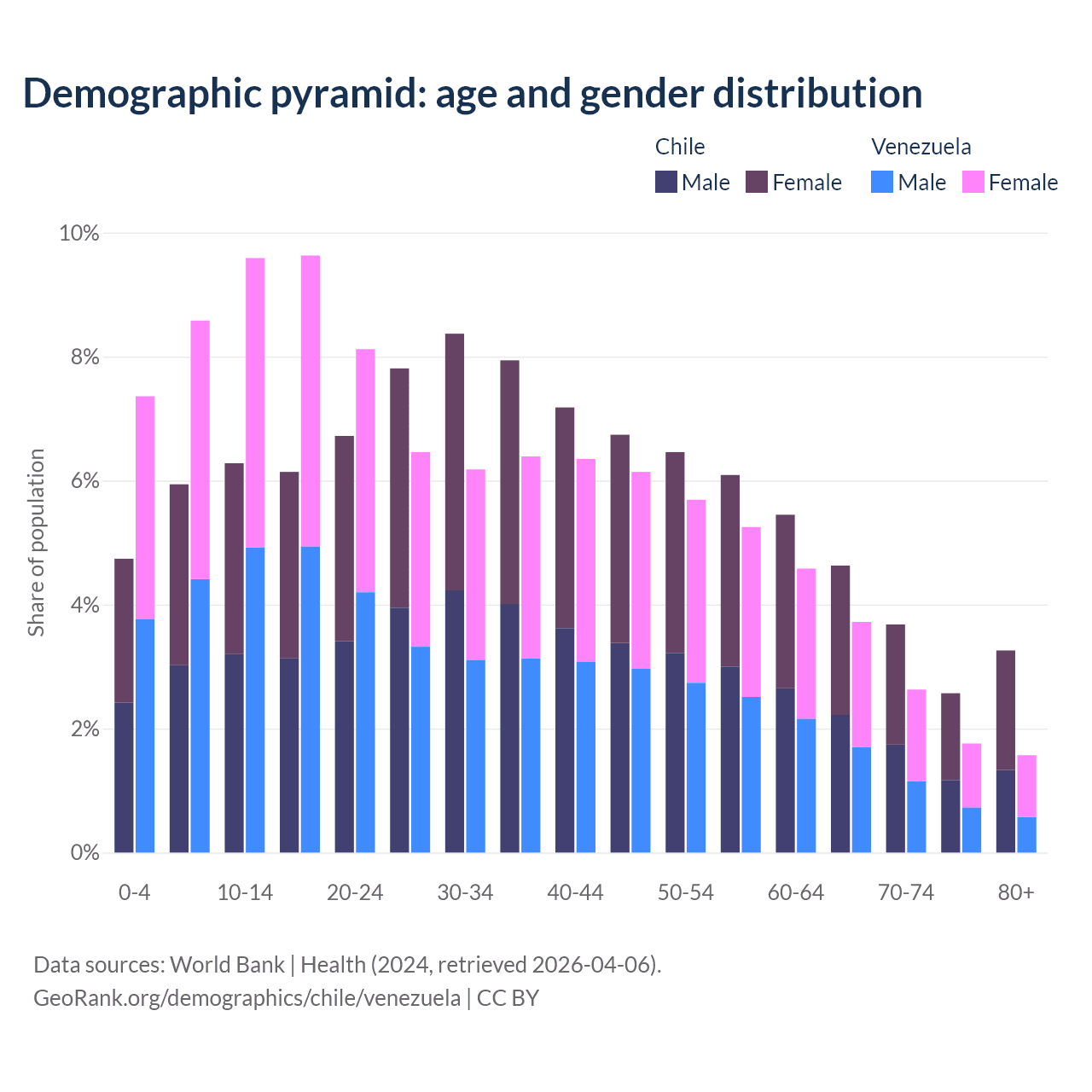 - Chile is ranked 61/196 by median age (oldest to youngest) vs 104/196 for Venezuela.