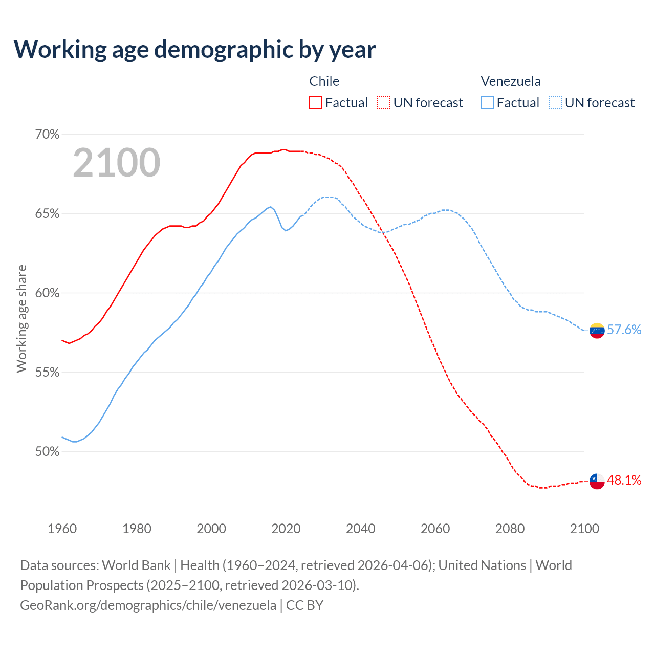 Median age Chile vs Venezuela, 1960-2100