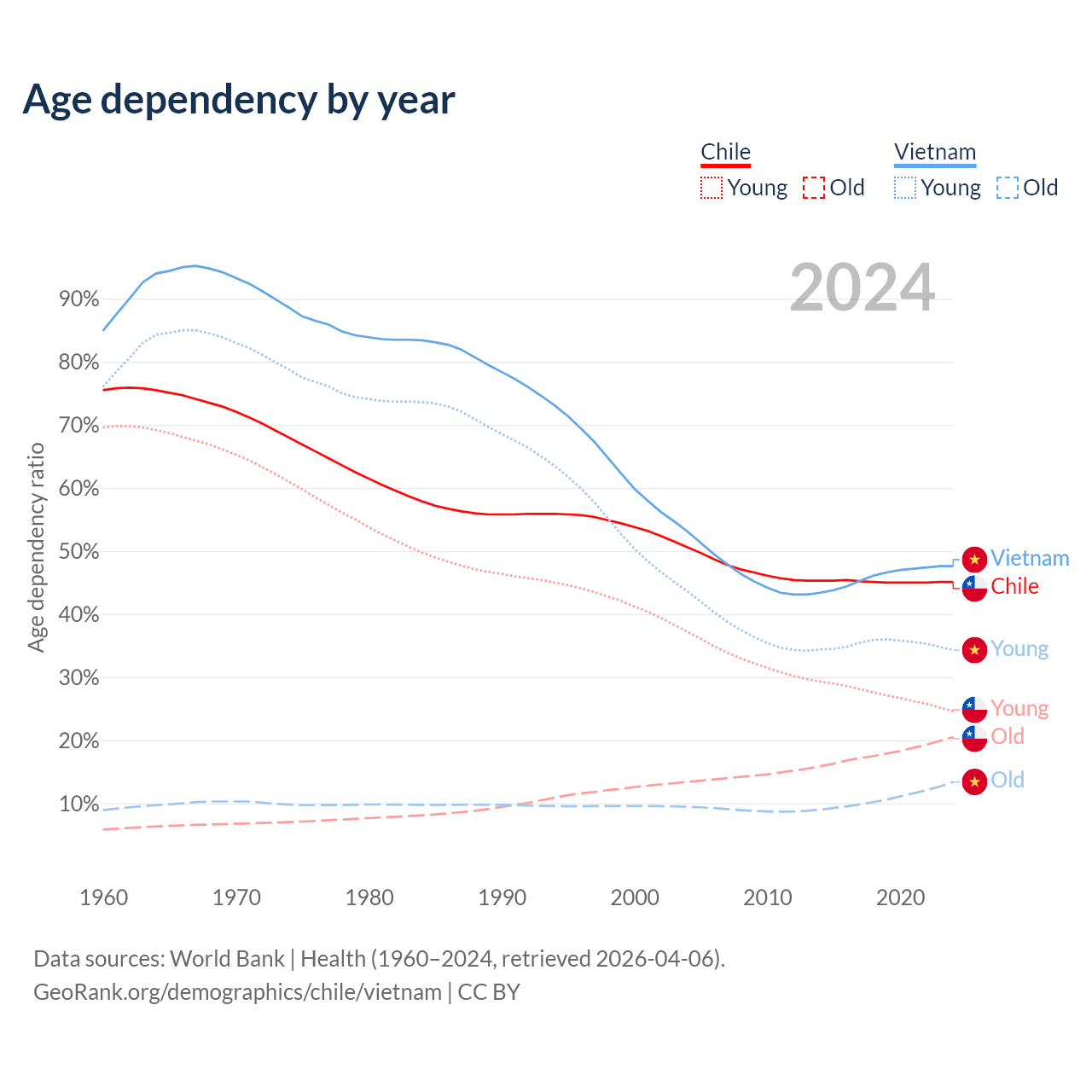 - Chile is ranked 61/196 by median age (oldest to youngest) vs 84/196 for Vietnam.
