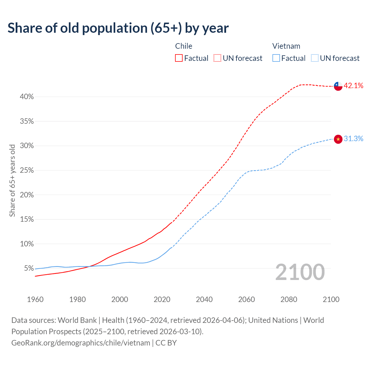 The share of older people aged 65 and over is 14.1% in Chile and 9.05% in Vietnam. Life expectancy in Chile compared to Vietnam .