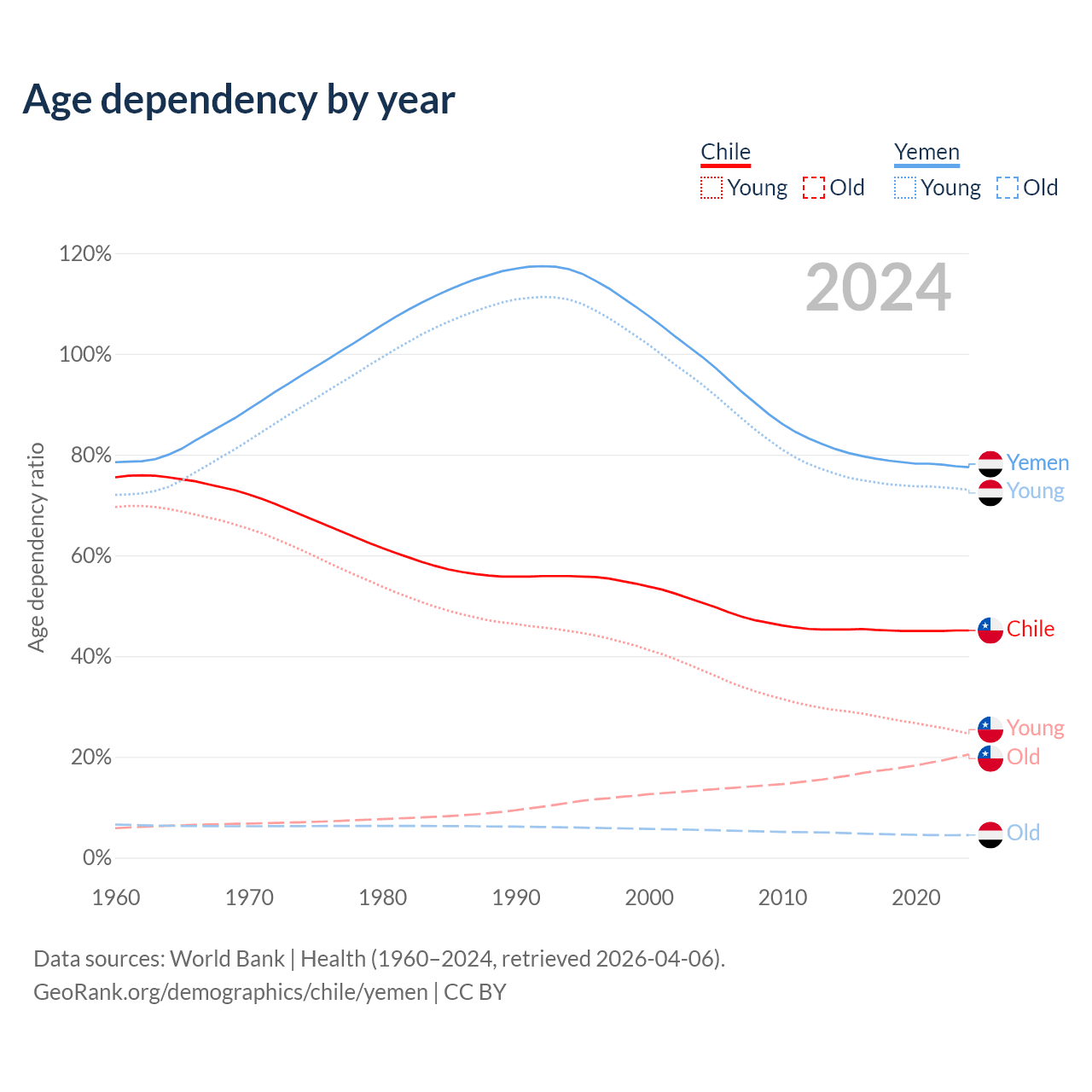 - The share of old-age demographic (65+) in Chile is 14.1% vs 2.52% in Yemen.