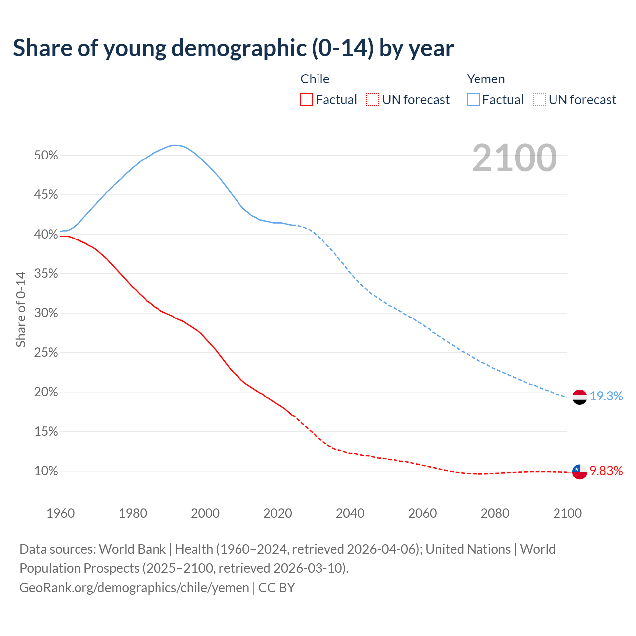 - The share of young demographic (0-15 years old) in Chile is 17% vs 41.1% in Yemen.