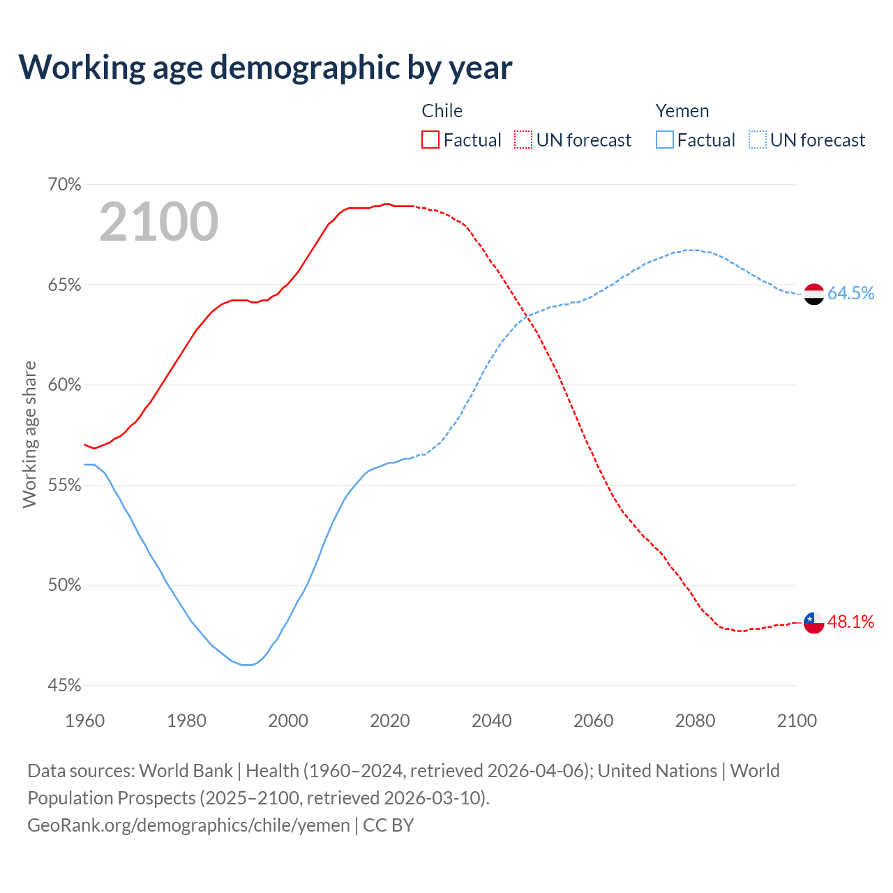 - Chile has 13.8M working age adults (aged 15-64) vs 24.4M in Yemen.