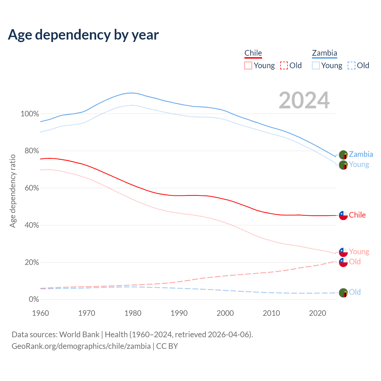 The share of older people aged 65 and over is 14.1% in Chile and 1.95% in Zambia. Life expectancy in Chile compared to Zambia .