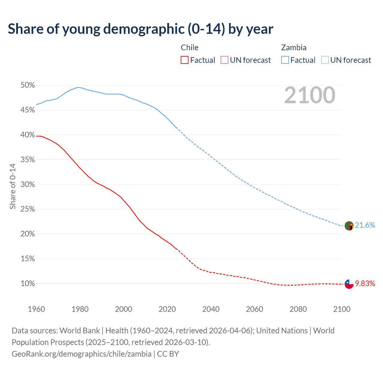 - The share of young demographic (0-15 years old) in Chile is 17% vs 41.5% in Zambia.