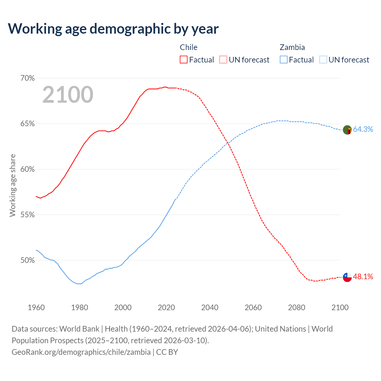 - Chile has 13.8M working age adults (aged 15-64) vs 12.8M in Zambia.